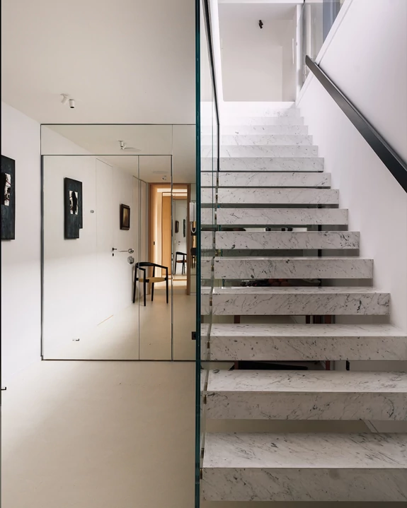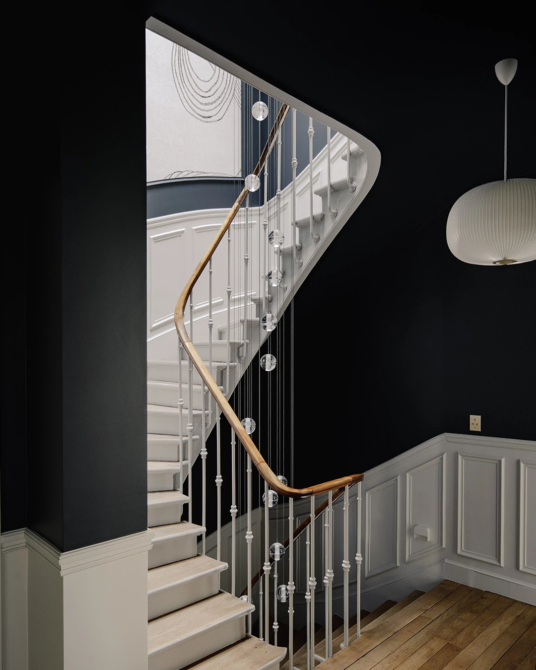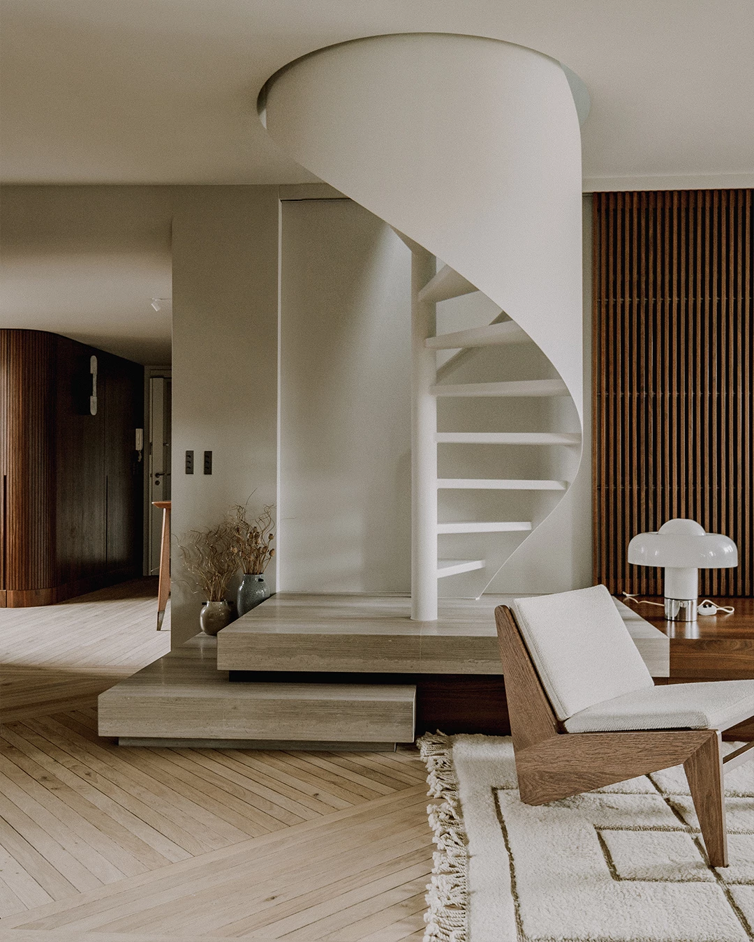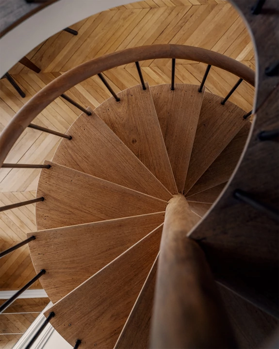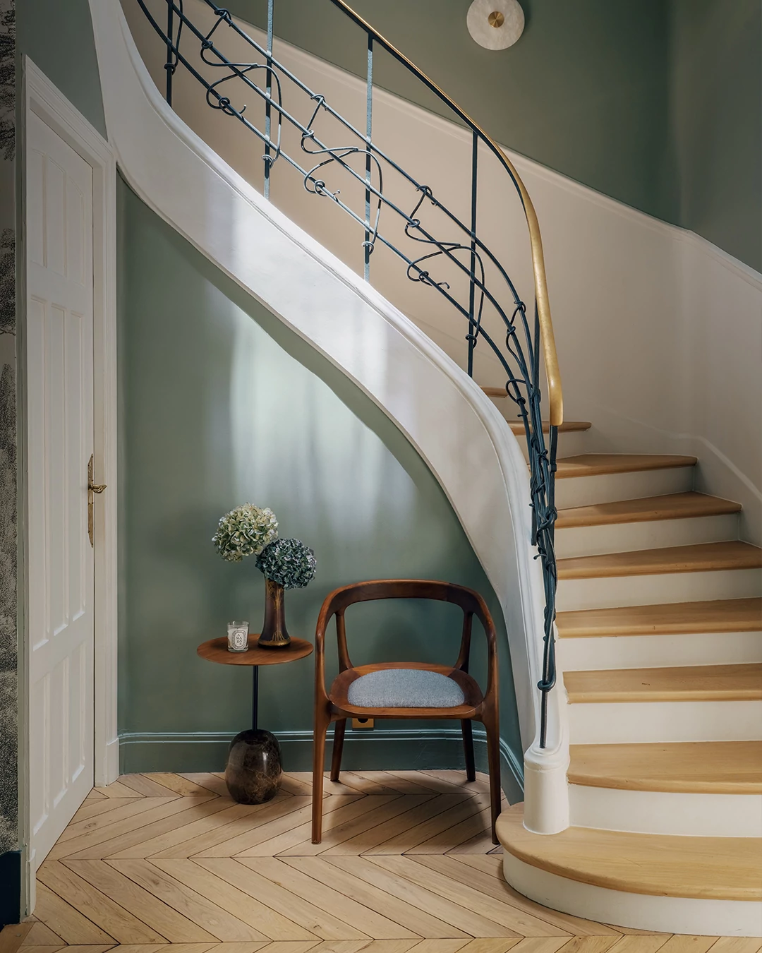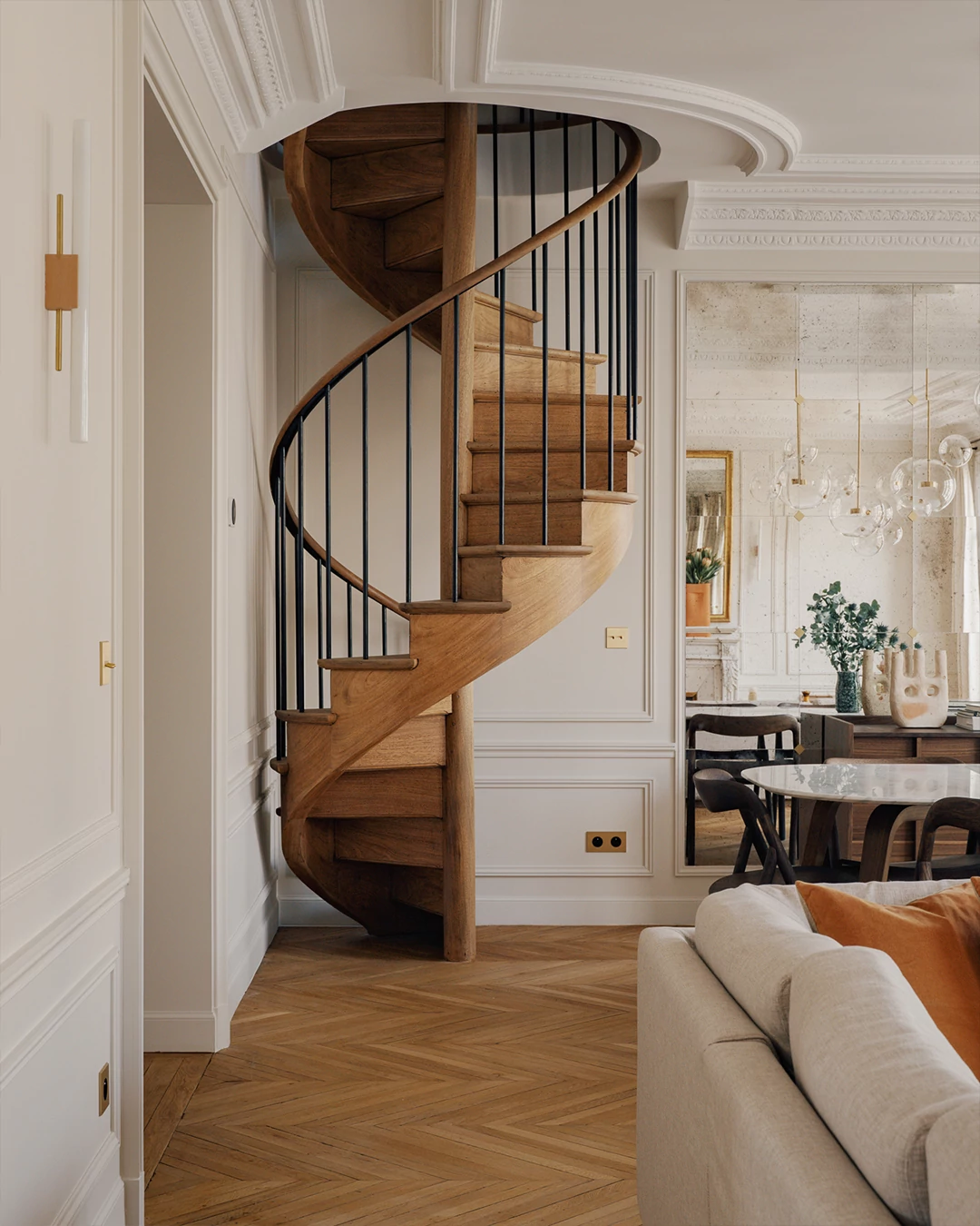 In each of our projects, the staircase is designed as an element in its own right. Some are original, such as this wooden staircase by Madeleine Castaing, which has been restored while preserving its curves and old-world charm. Others are entirely designed by us, but always with a view to blending in perfectly with the apartment's aesthetic.