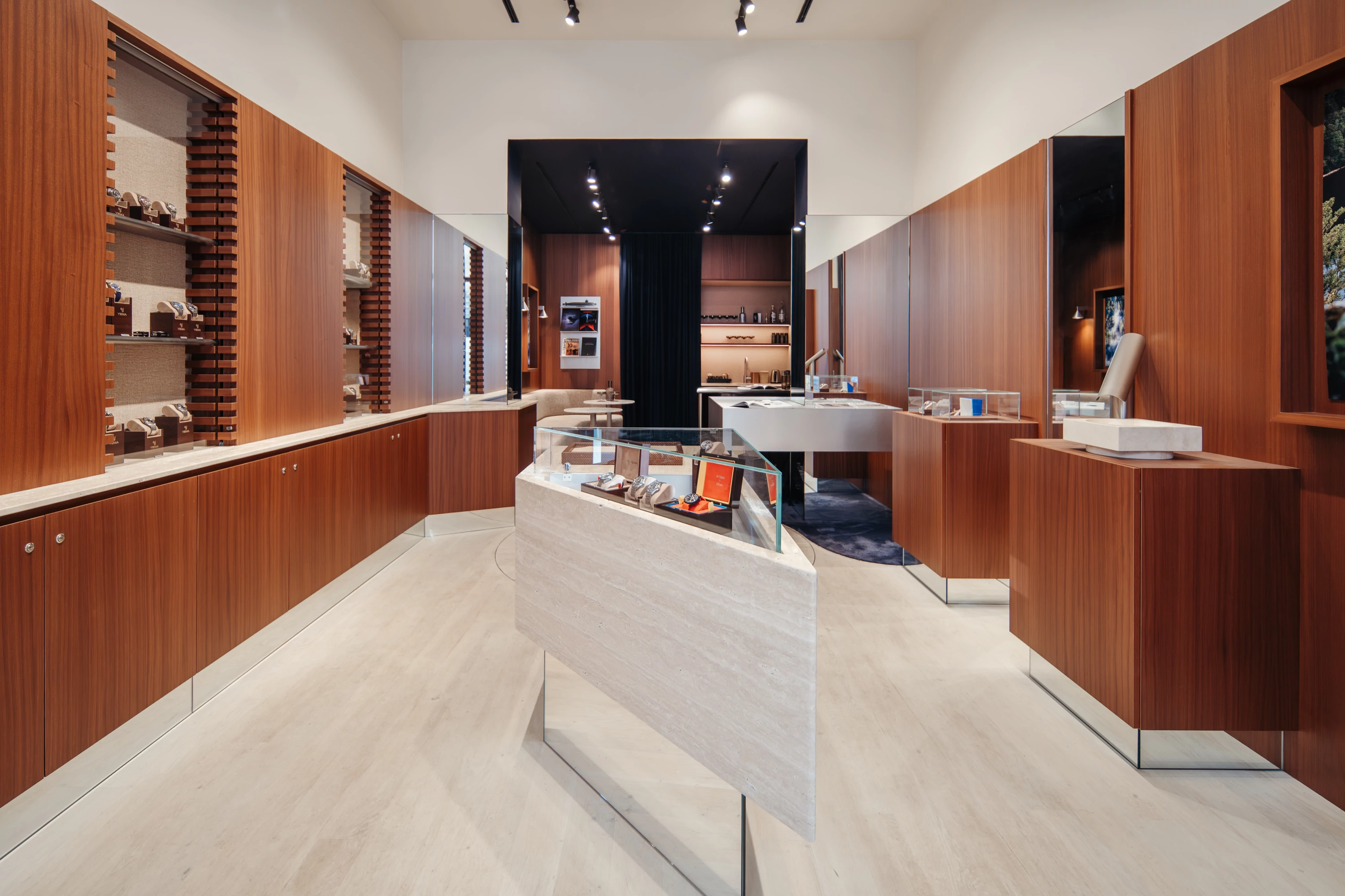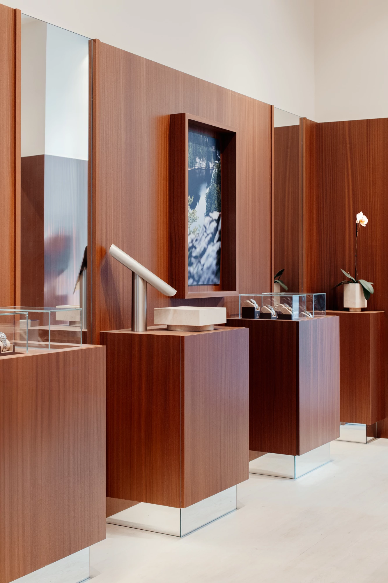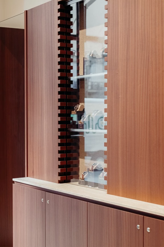 We therefore chose walnut, a noble wood with deep shades, for most of the boutique's interior design and for covering some of the walls. It adds a warm touch, contrasting with the floor and other materials chosen: mirror, glass, stainless steel, metal, and travertine. These combinations, reminiscent of the materials used in watches, emphasize the timeless elegance of the space. To highlight the display windows, we designed a notched frame reminiscent of the gears in watch mechanisms.