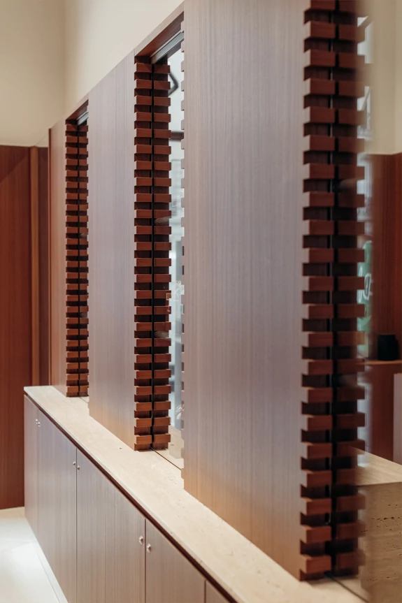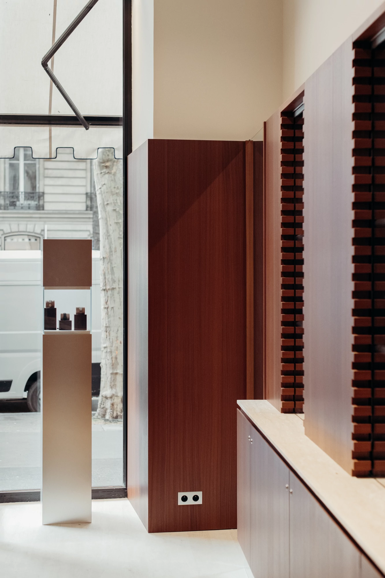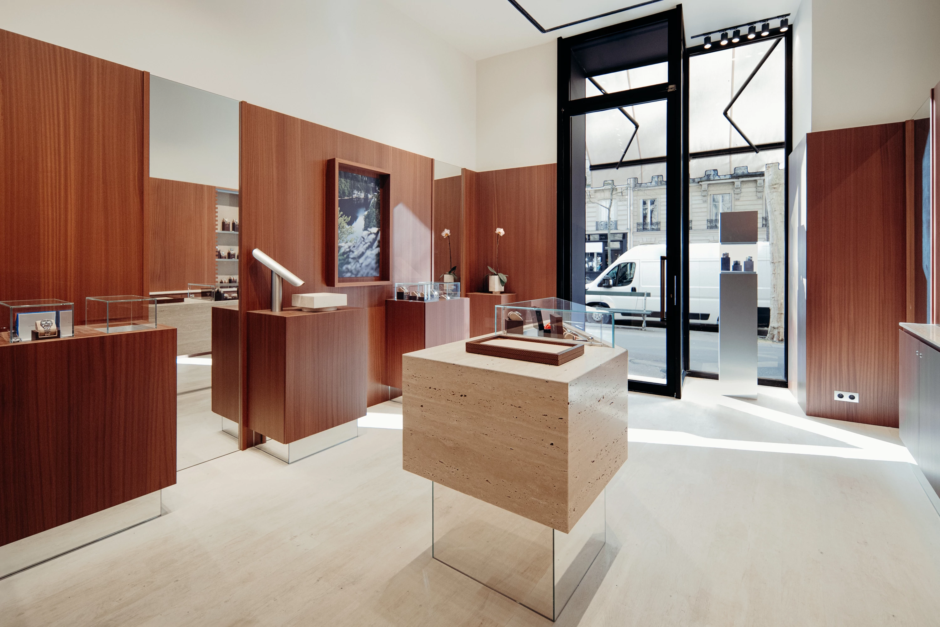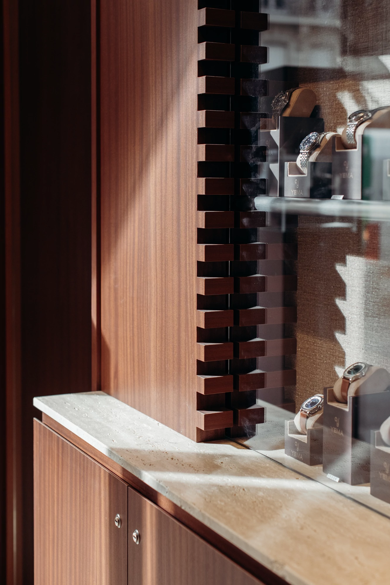 We therefore chose walnut, a noble wood with deep shades, for most of the boutique's interior design and for covering some of the walls. It adds a warm touch, contrasting with the floor and other materials chosen: mirror, glass, stainless steel, metal, and travertine. These combinations, reminiscent of the materials used in watches, emphasize the timeless elegance of the space. To highlight the display windows, we designed a notched frame reminiscent of the gears in watch mechanisms.