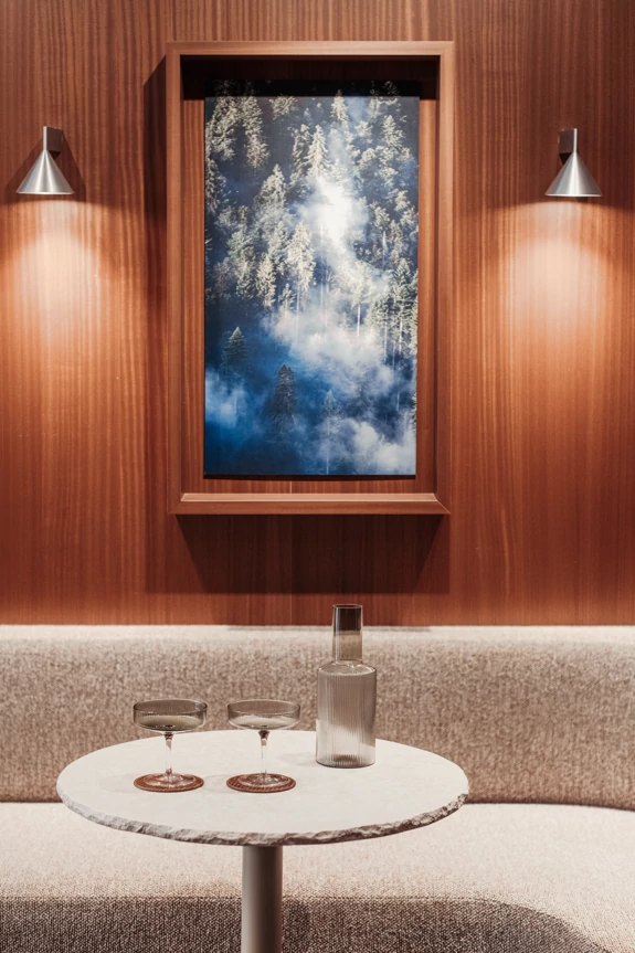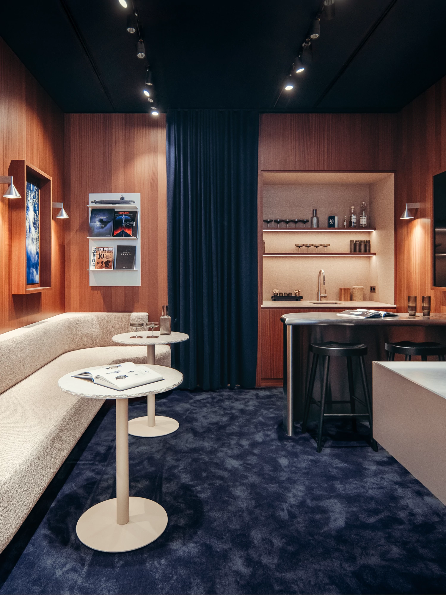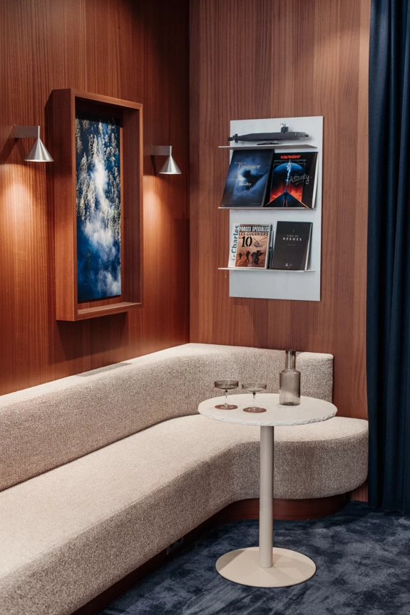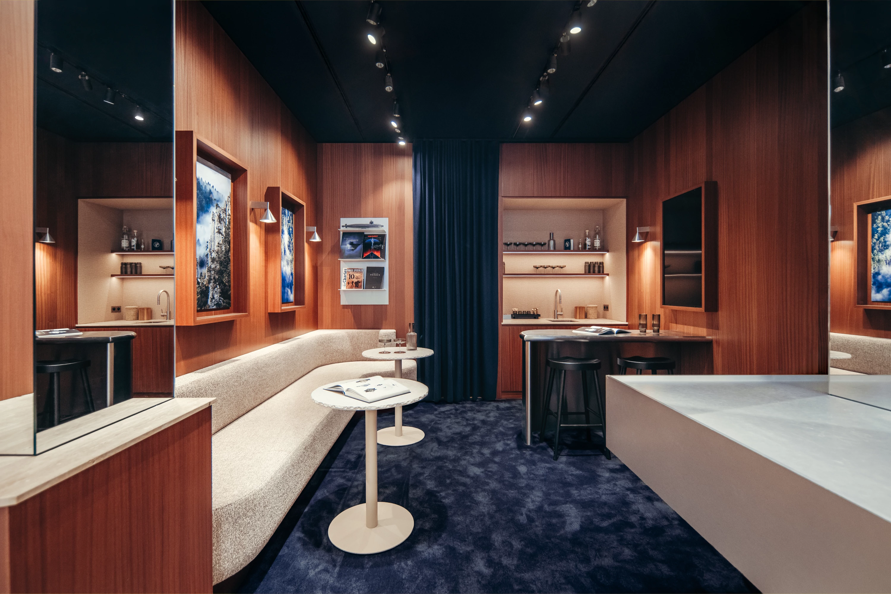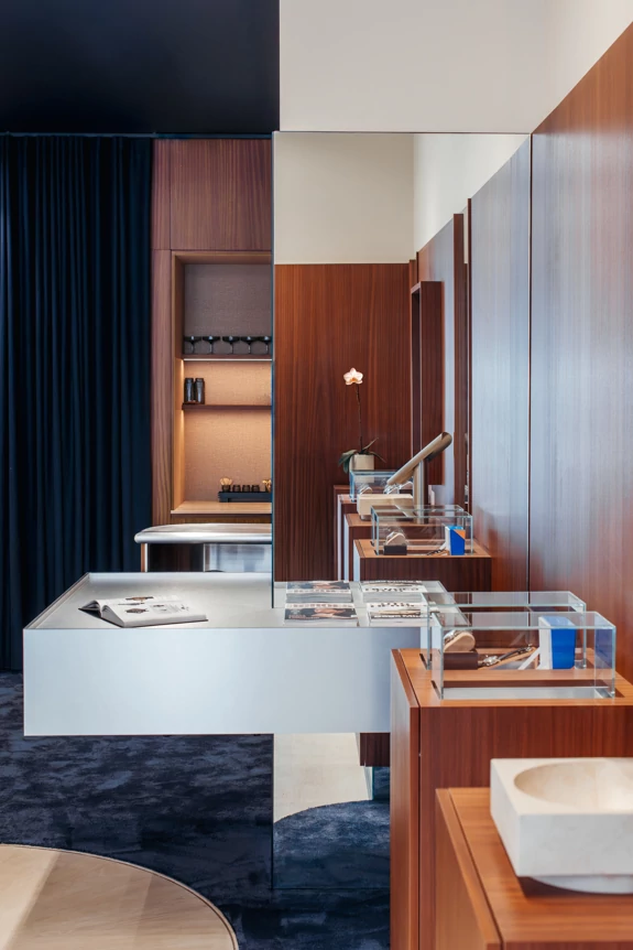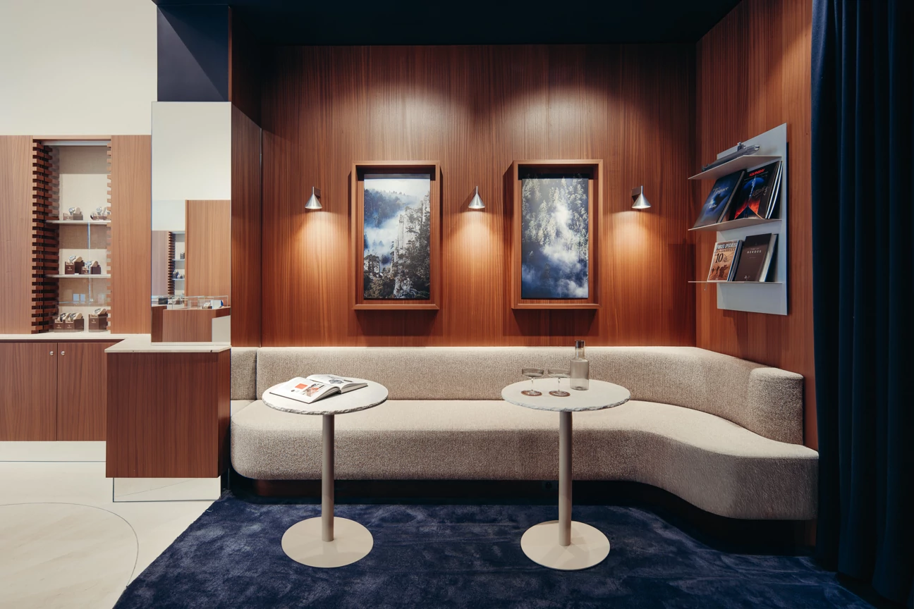 Once past the display area at the front of the store, where all the watches are on display, customers discover a more subdued atmosphere at the back. With midnight blue carpeted floors, a custom-made curved bench, and a small dining area with a solid stainless steel bar... This intimate space invites customers to sit down, explore, take their time, and feel at home, or as if they were in a discreet hotel lounge.