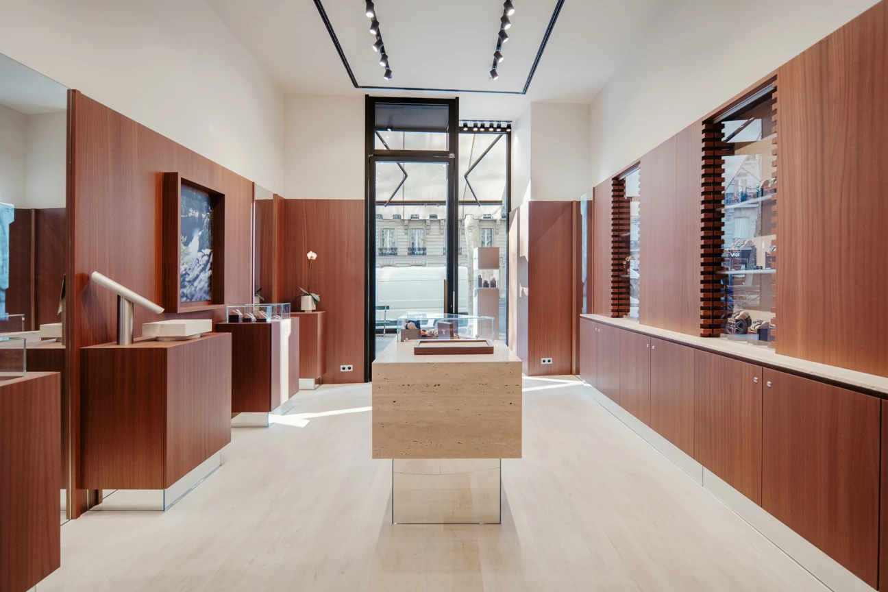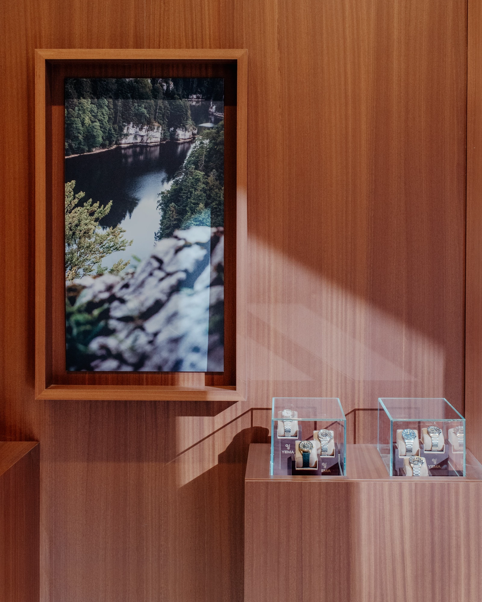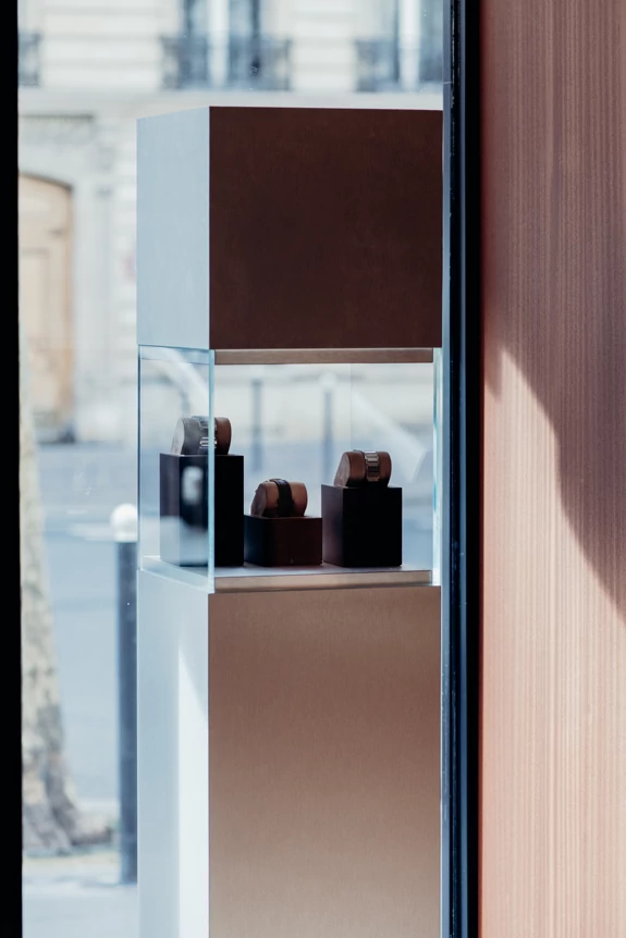 Yema is a French company based in Morteau in the Doubs region, the cradle of French watchmaking. For their first boutique, they chose Boulevard Saint Germain, in the heart of Paris's 6th arrondissement. The history of this independent family brand and its region of origin (eastern France, close to Switzerland) had to be reflected in the overall atmosphere of the place.