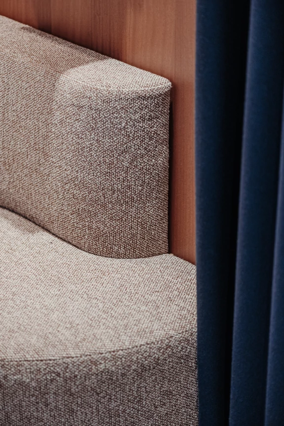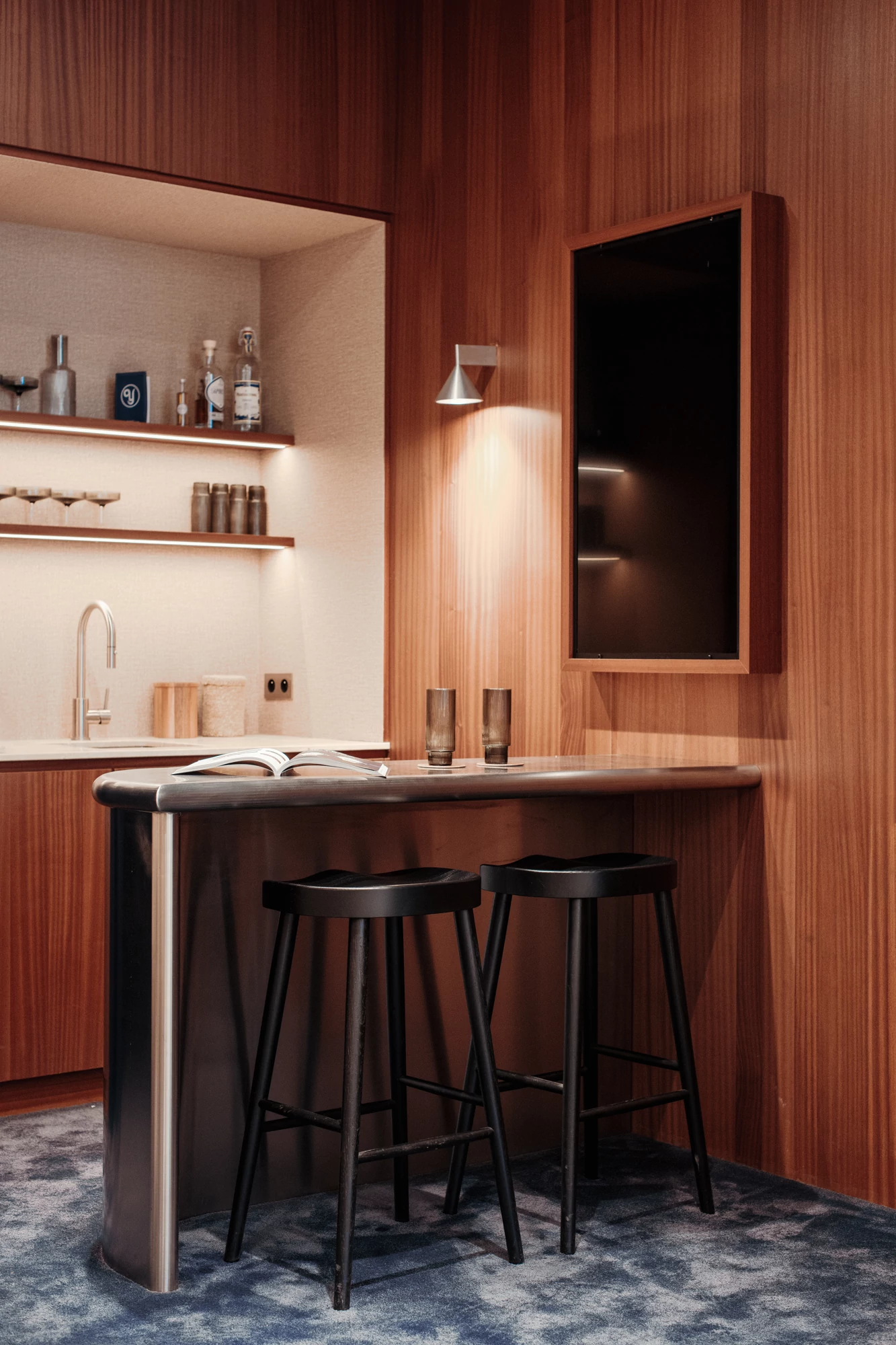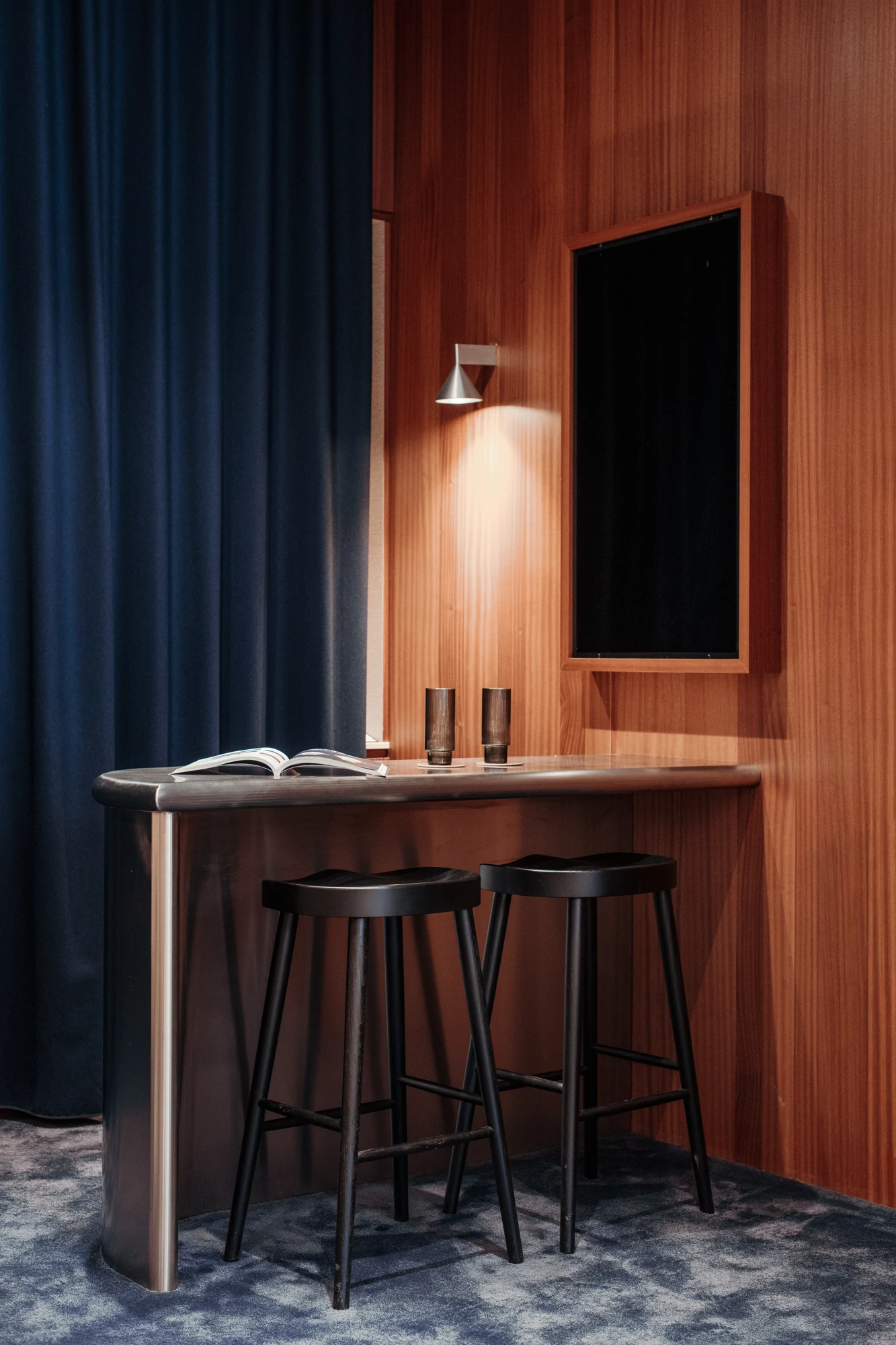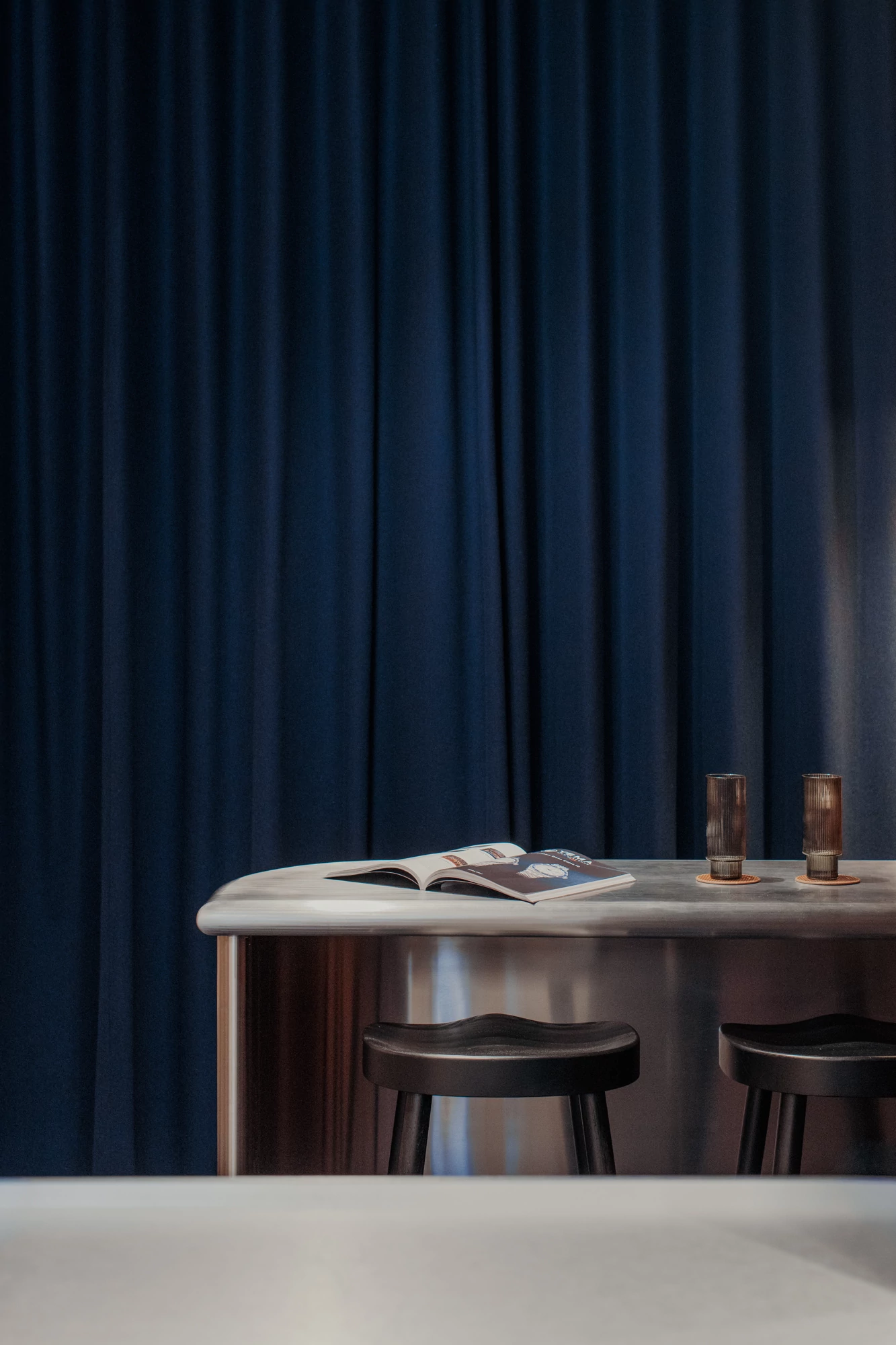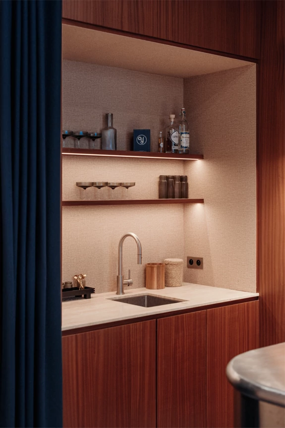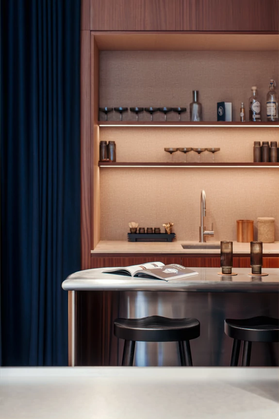 A thick velvet curtain separates the staff area and can also completely conceal the kitchen when drawn. This helps to reinforce the intimate atmosphere of the space.