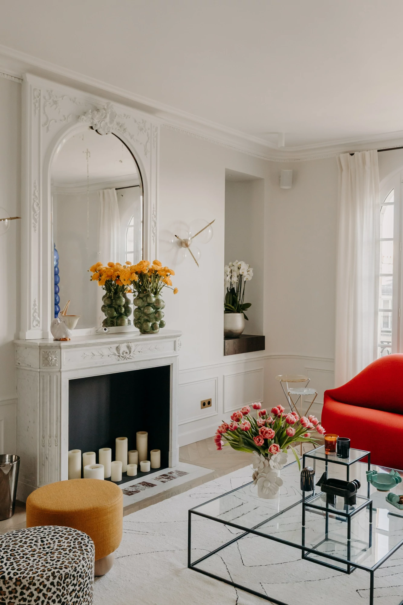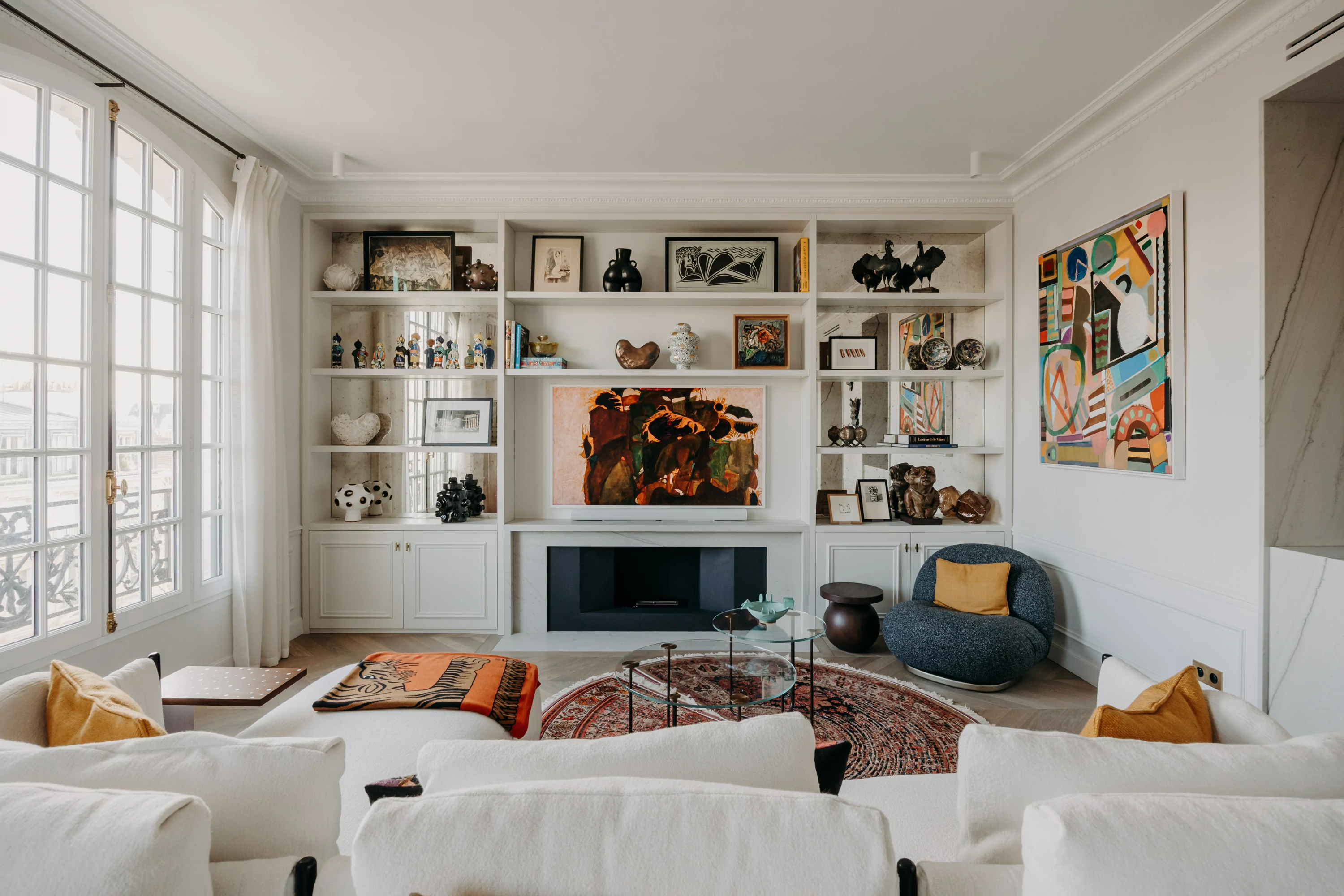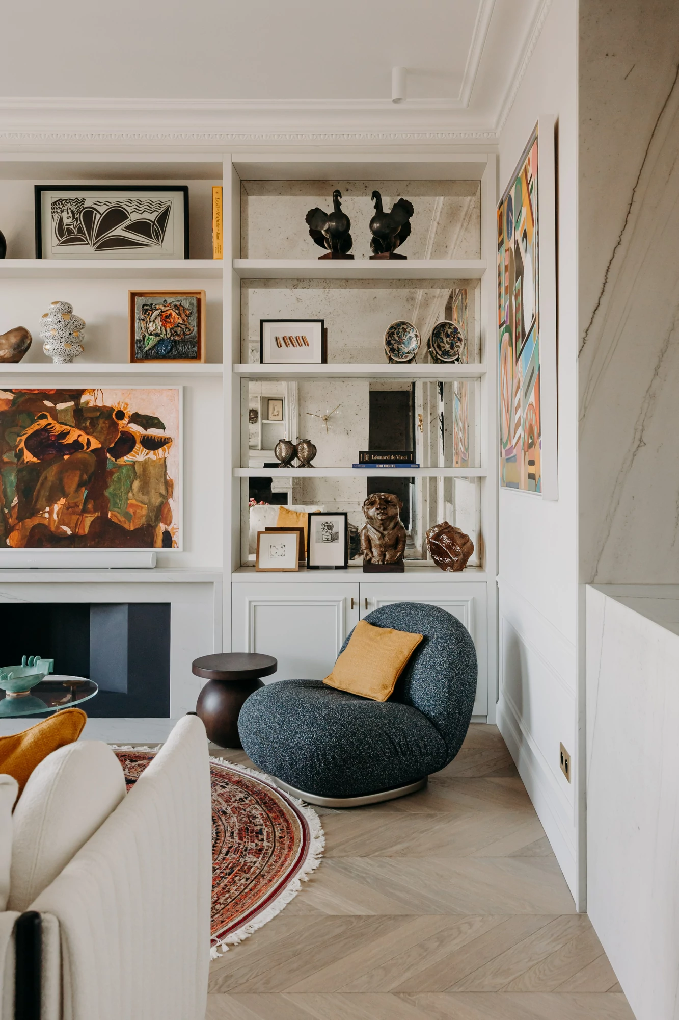 The ground floor is organized around a spacious double living room, designed as a generous and flexible living space. A sofa running the length of the room helps define two distinct areas: a reception area centered around a renovated existing fireplace, and a more intimate space dedicated to the television, featuring a contemporary fireplace integrated into a custom-built bookcase. The use of aged mirrors enhances the depth and brightness of the entire space.