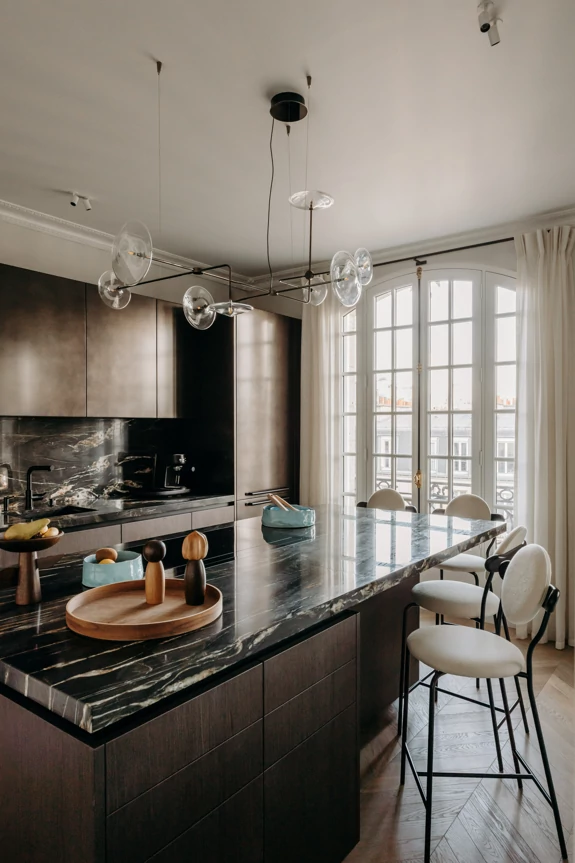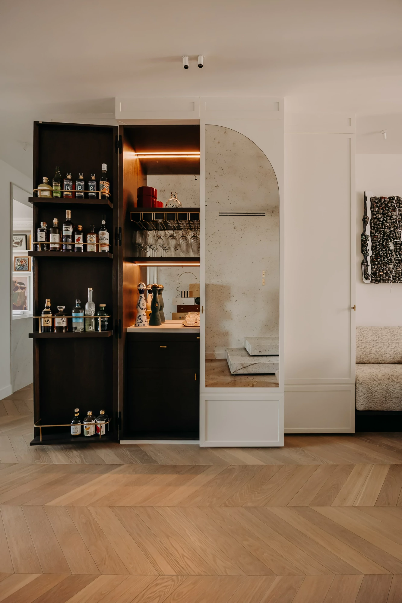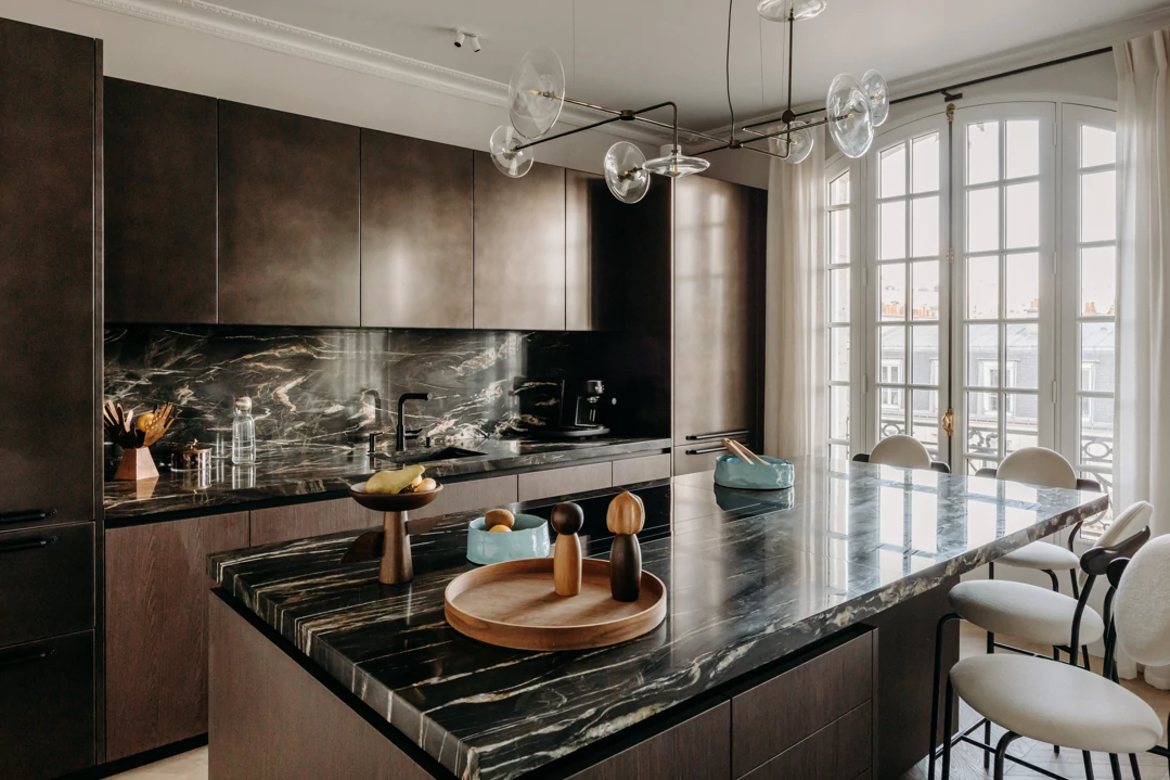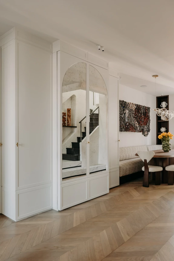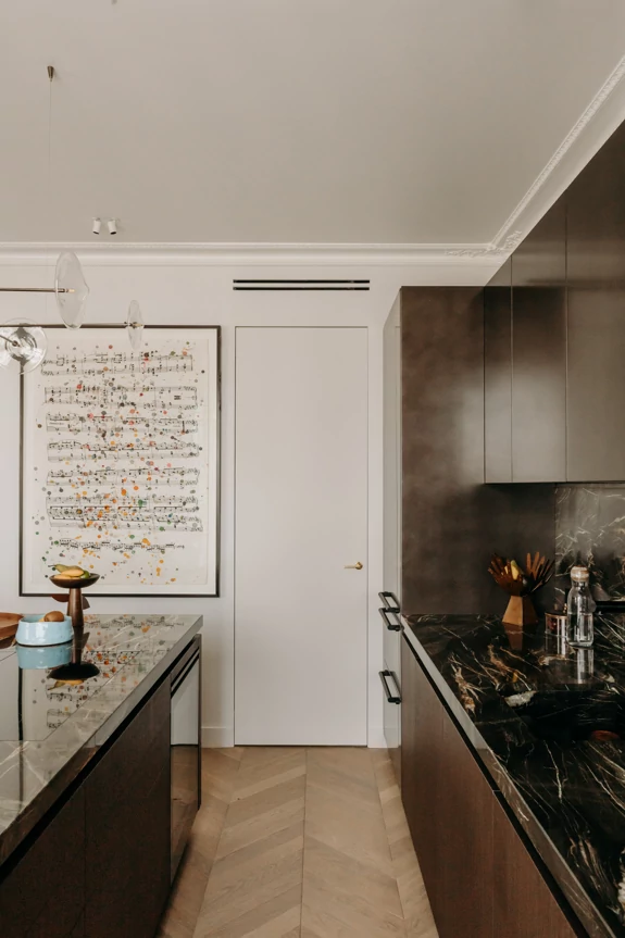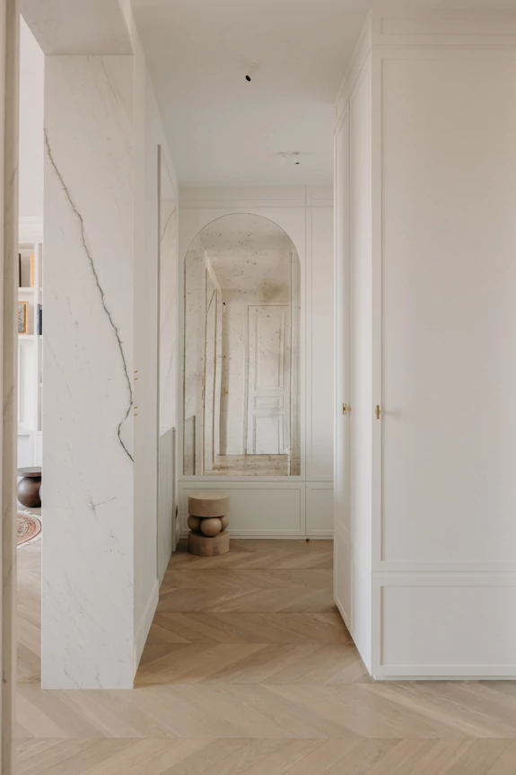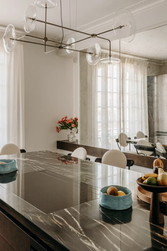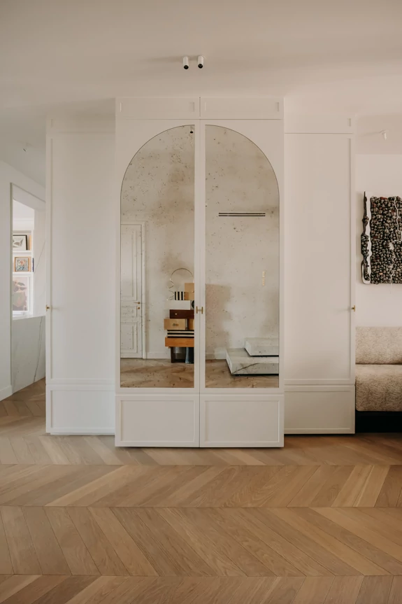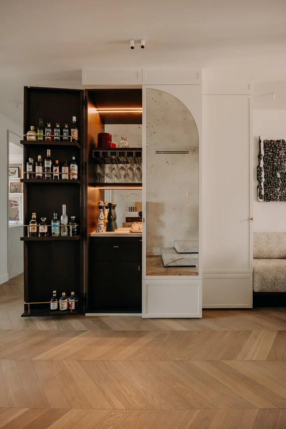 The semi-open kitchen flows seamlessly into the living room through visual openings. Crafted from high-quality materials (metallic lacquer, dark wood, and quartzite) it conceals all appliances for a clean, minimalist look. An aged mirror, finished with a trompe-l’œil effect, helps expand the space while concealing a restrictive load-bearing wall.