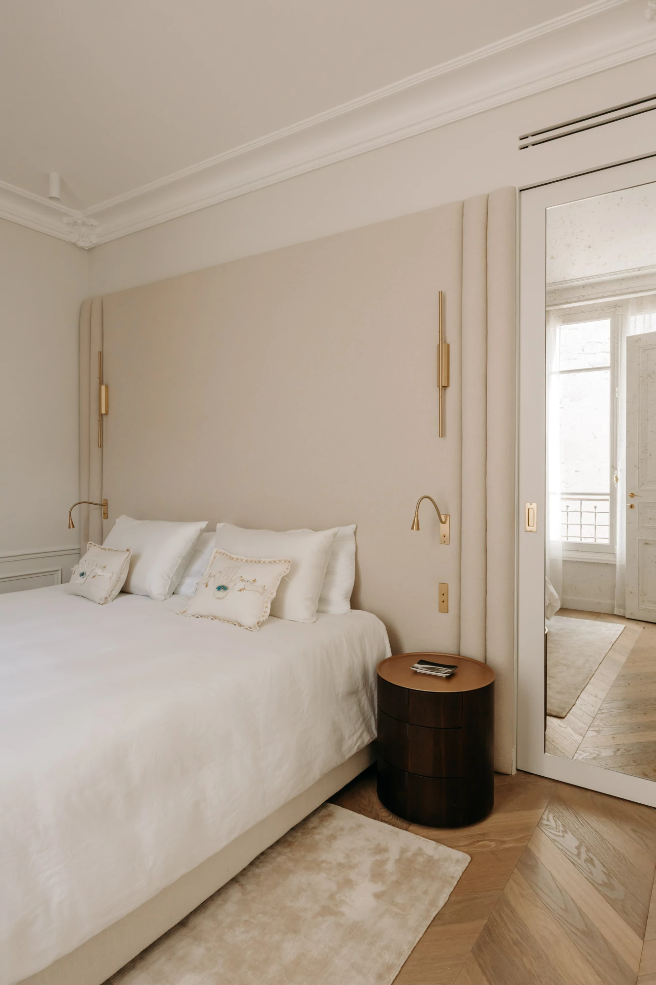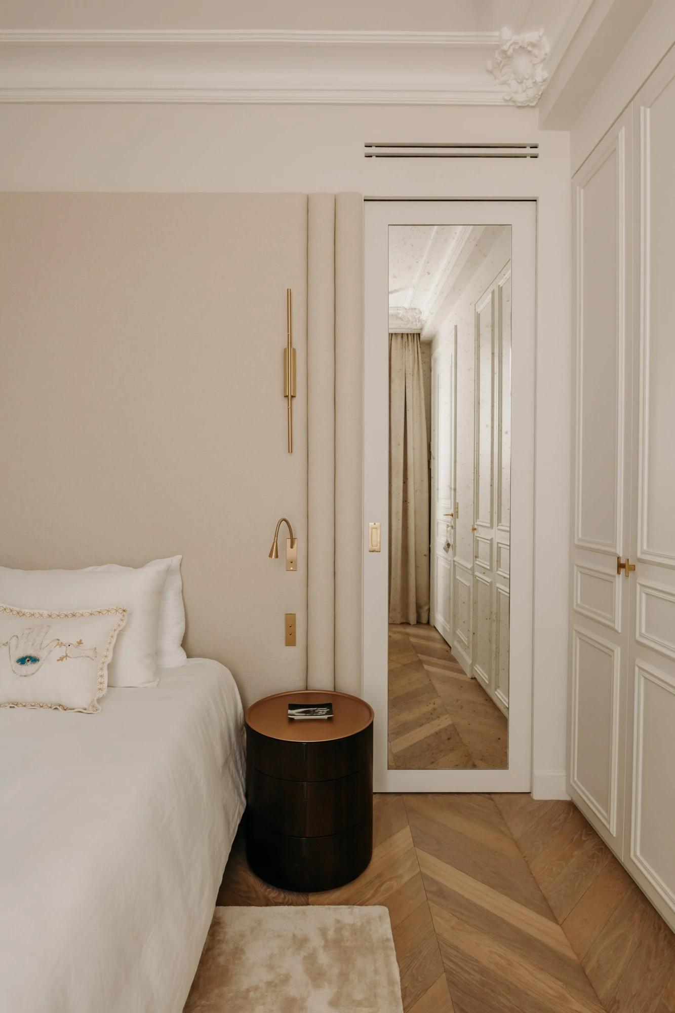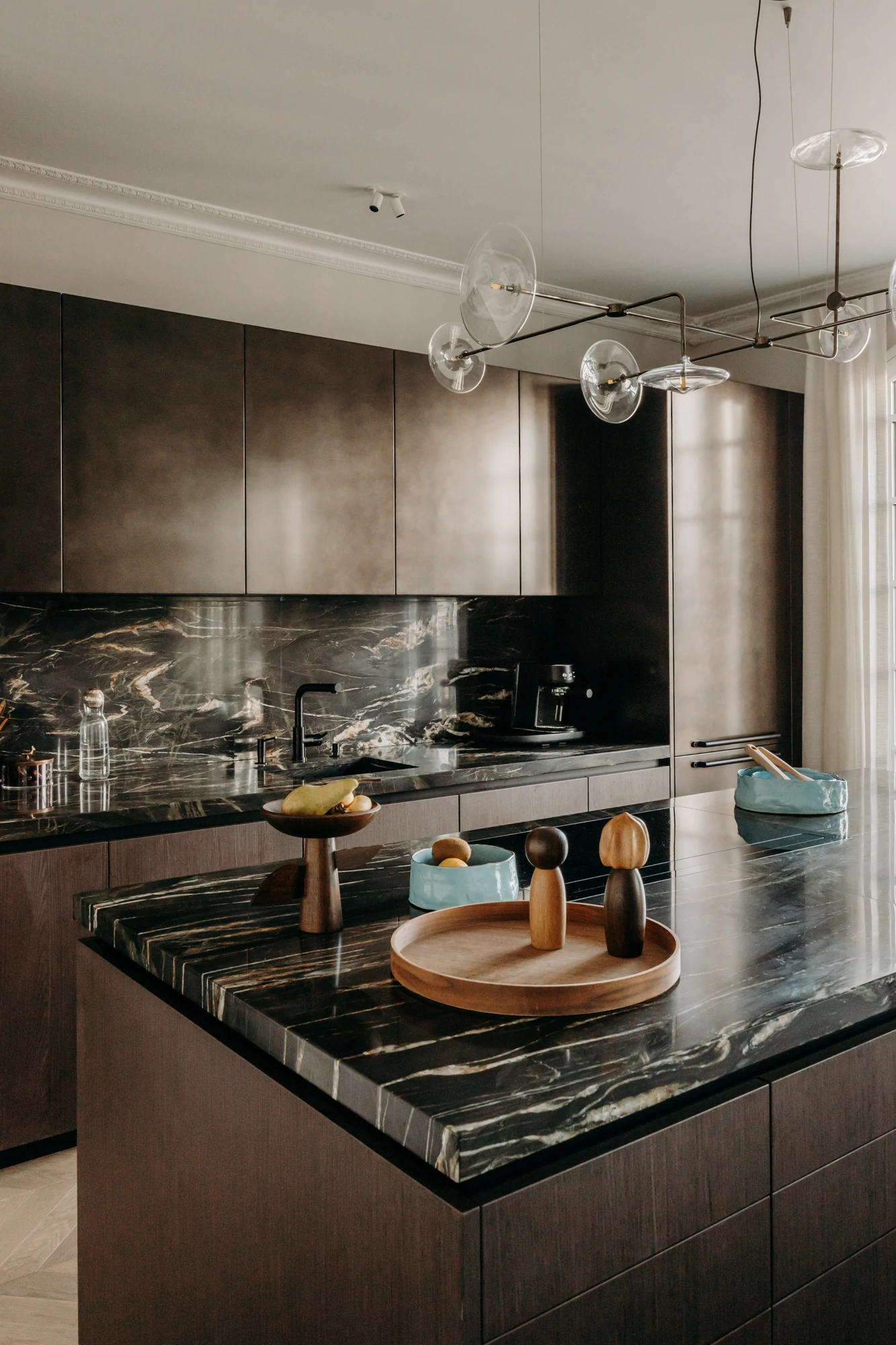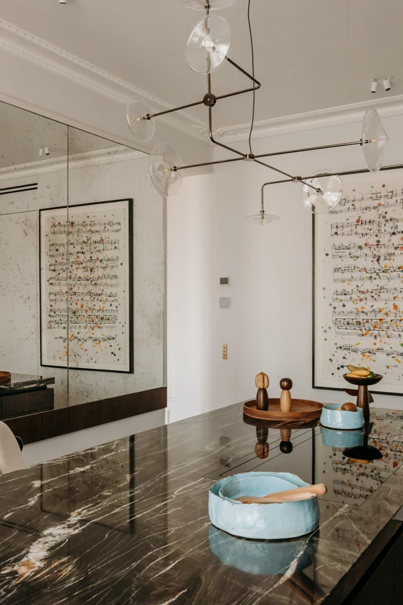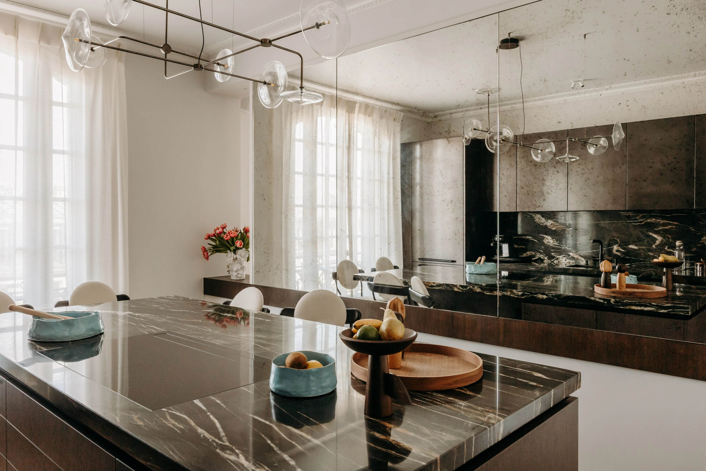 The semi-open kitchen flows seamlessly into the living room through visual openings. Crafted from high-quality materials (metallic lacquer, dark wood, and quartzite) it conceals all appliances for a clean, minimalist look. An aged mirror, finished with a trompe-l’œil effect, helps expand the space while concealing a restrictive load-bearing wall.