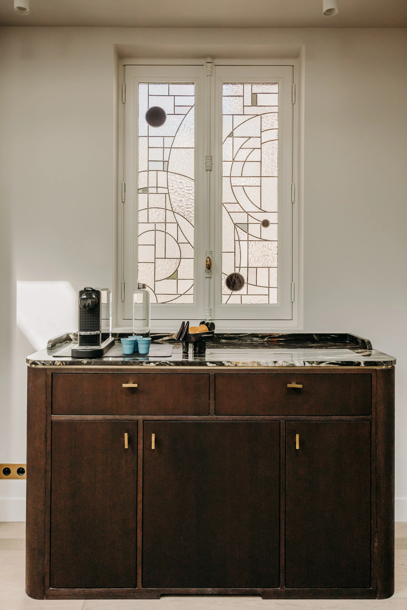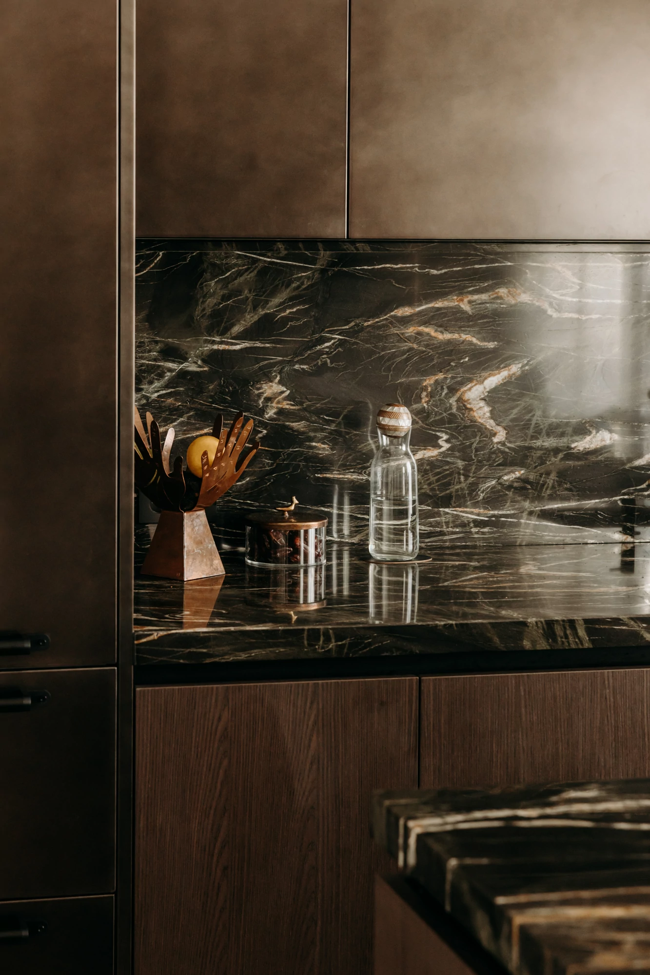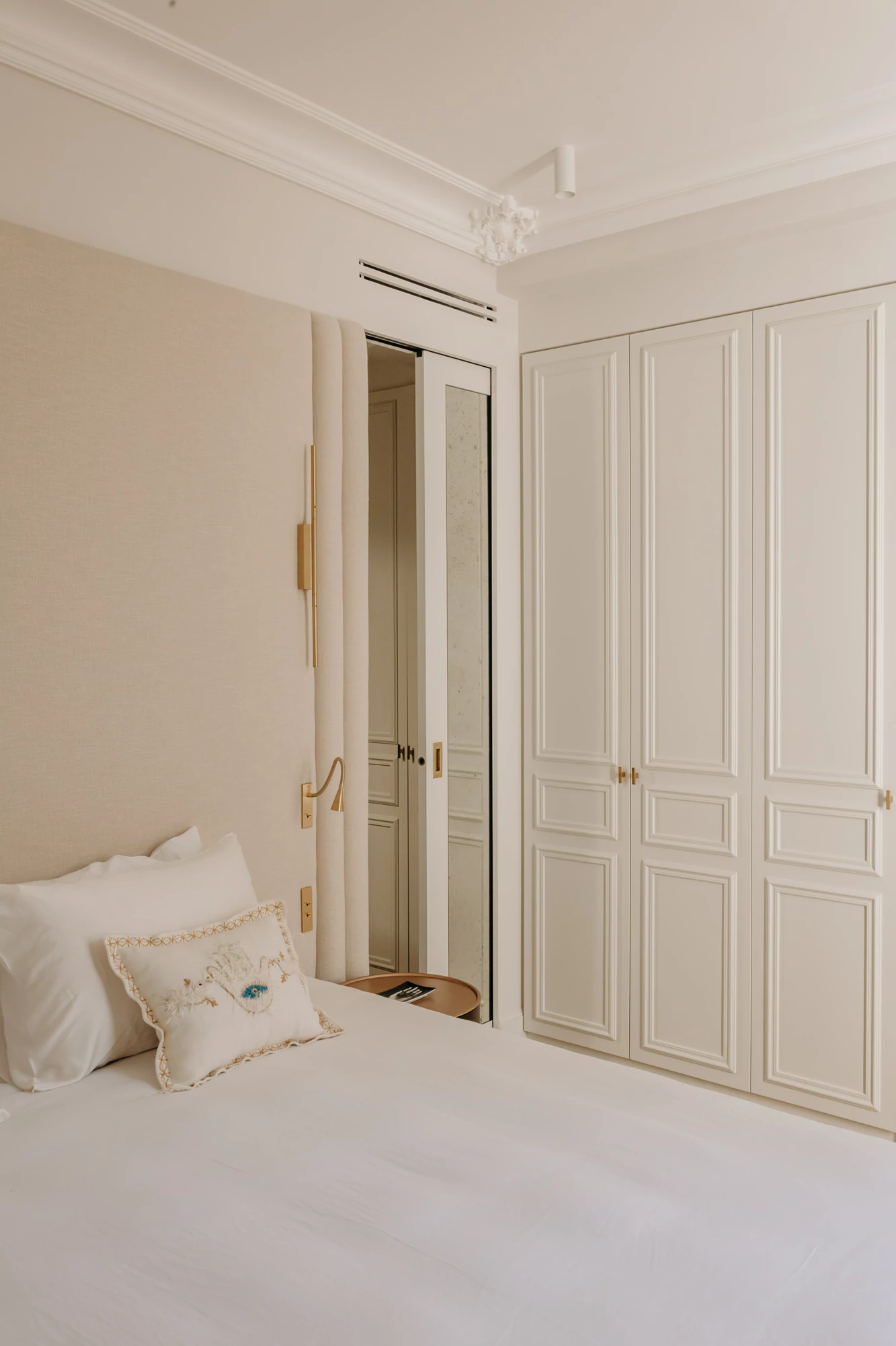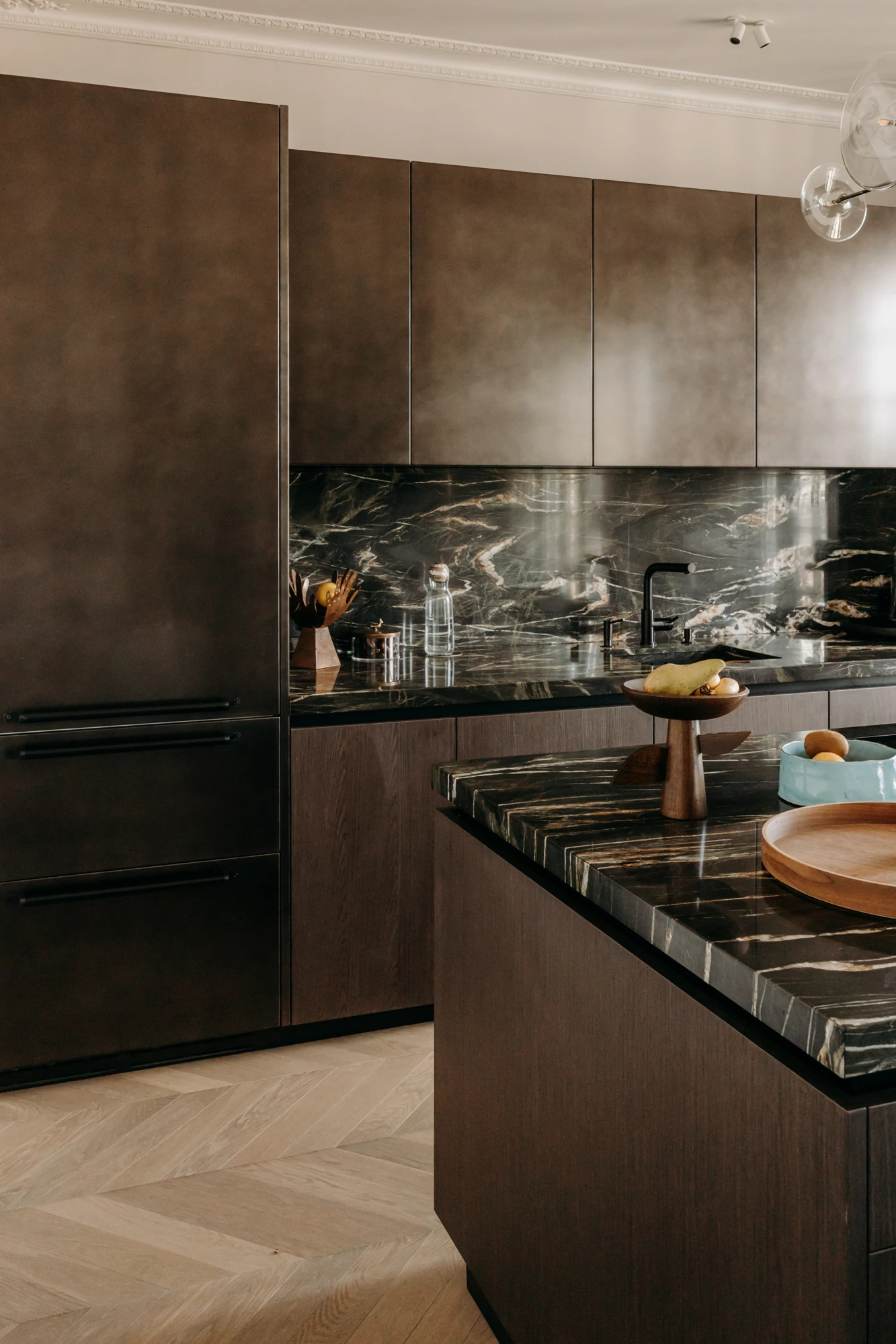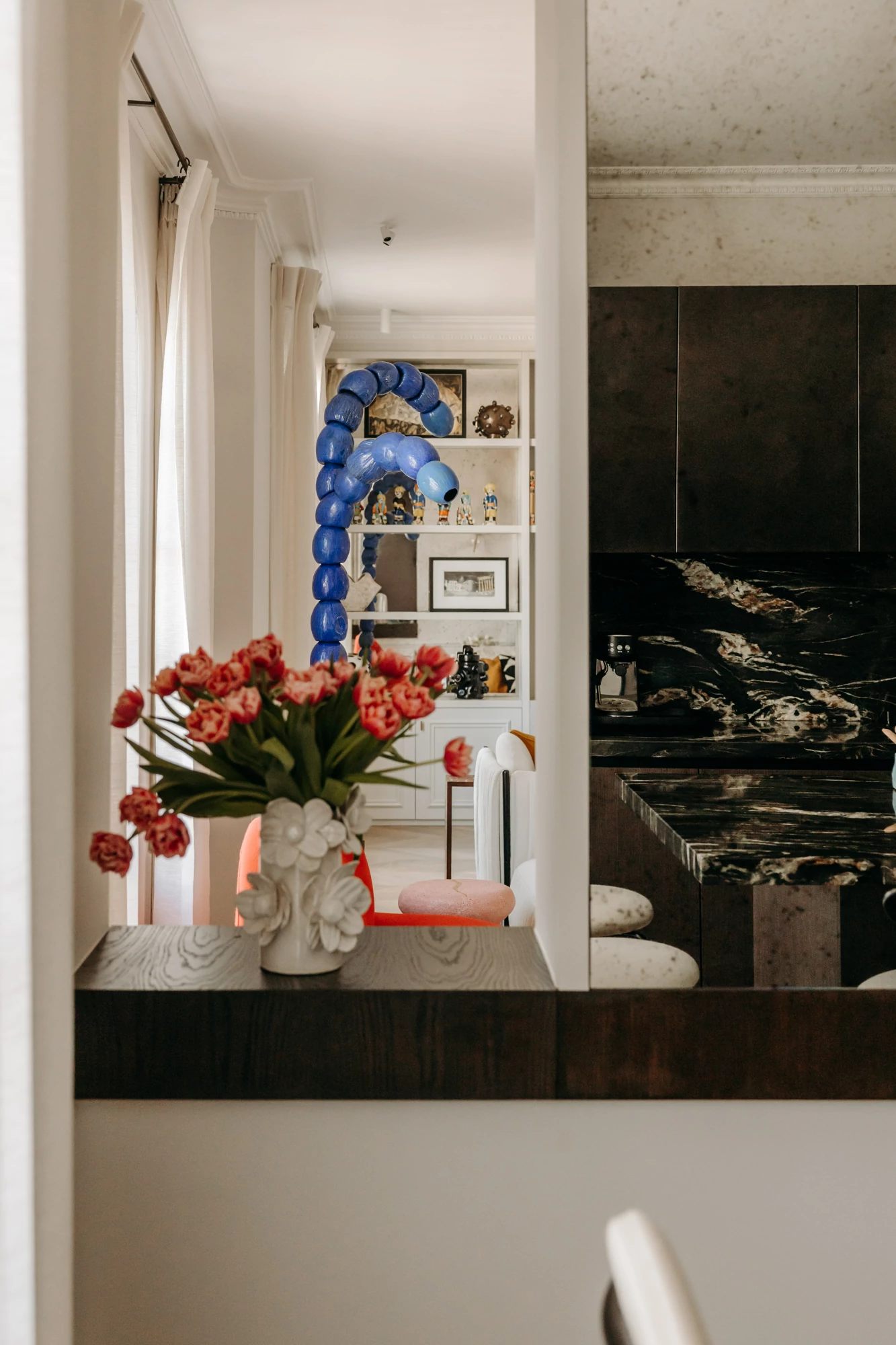 The semi-open kitchen flows seamlessly into the living room through visual openings. Crafted from high-quality materials (metallic lacquer, dark wood, and quartzite) it conceals all appliances for a clean, minimalist look. An aged mirror, finished with a trompe-l’œil effect, helps expand the space while concealing a restrictive load-bearing wall.
