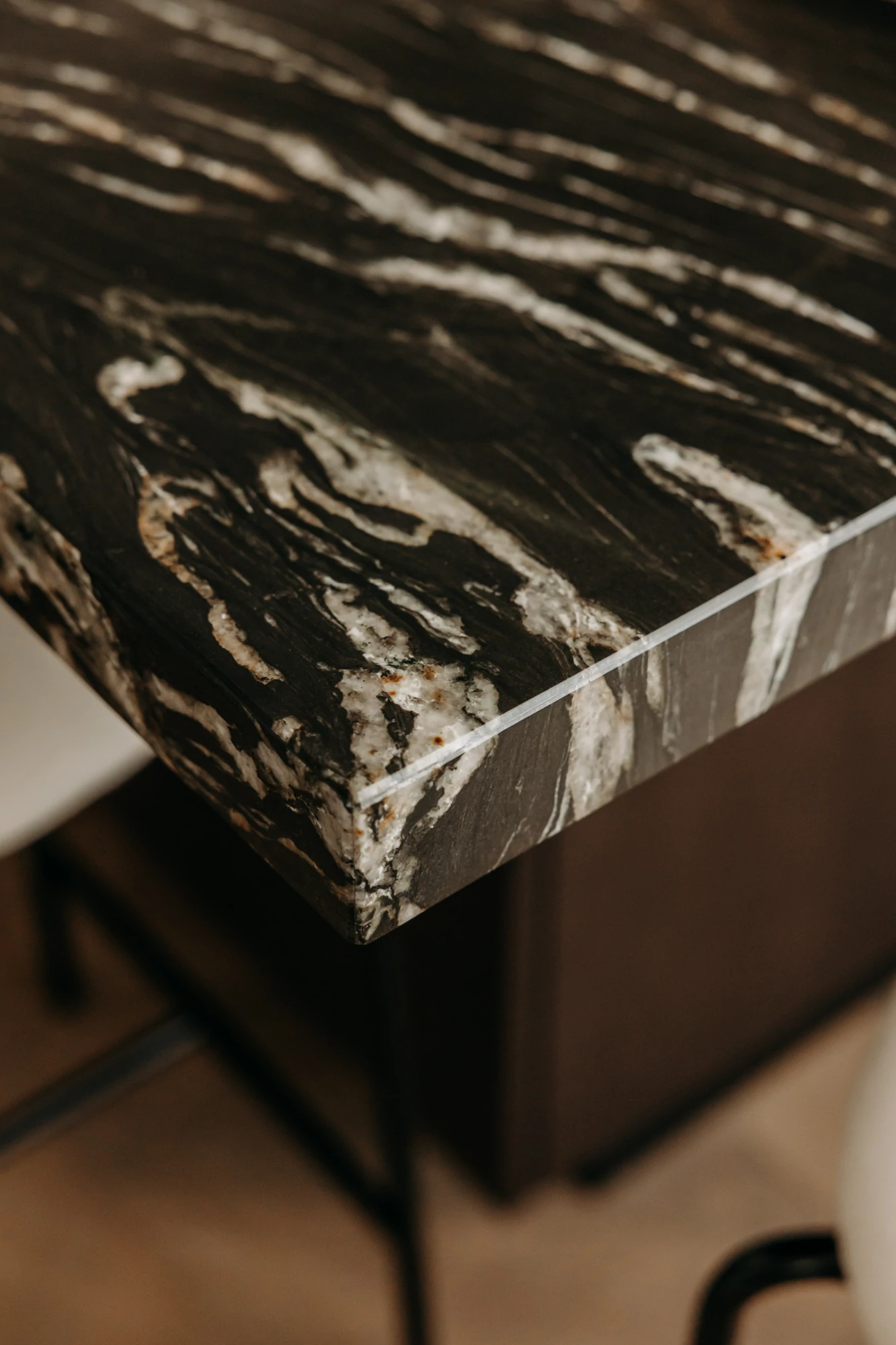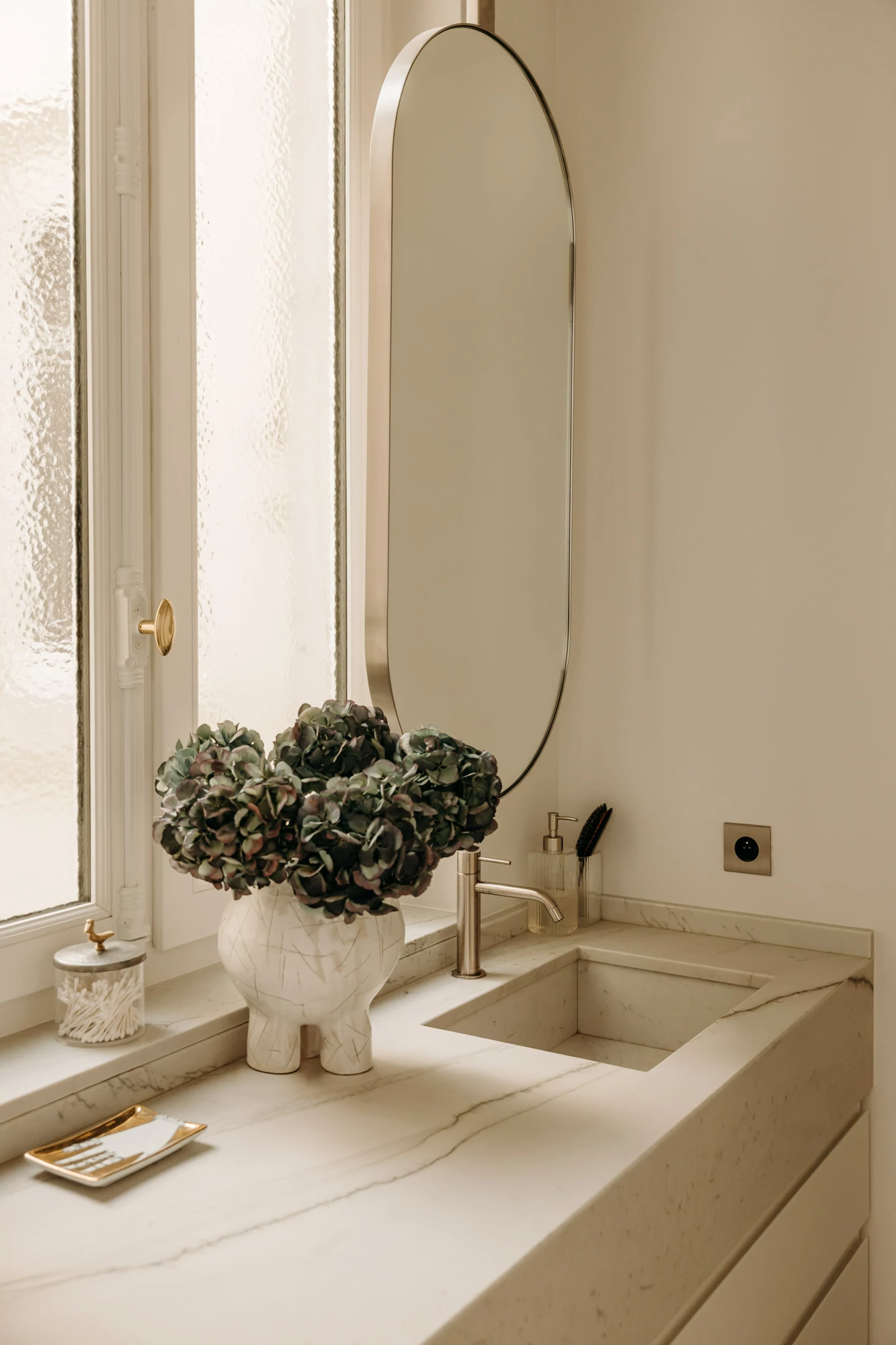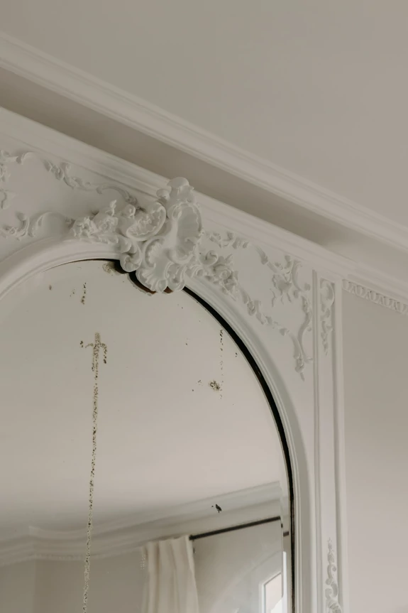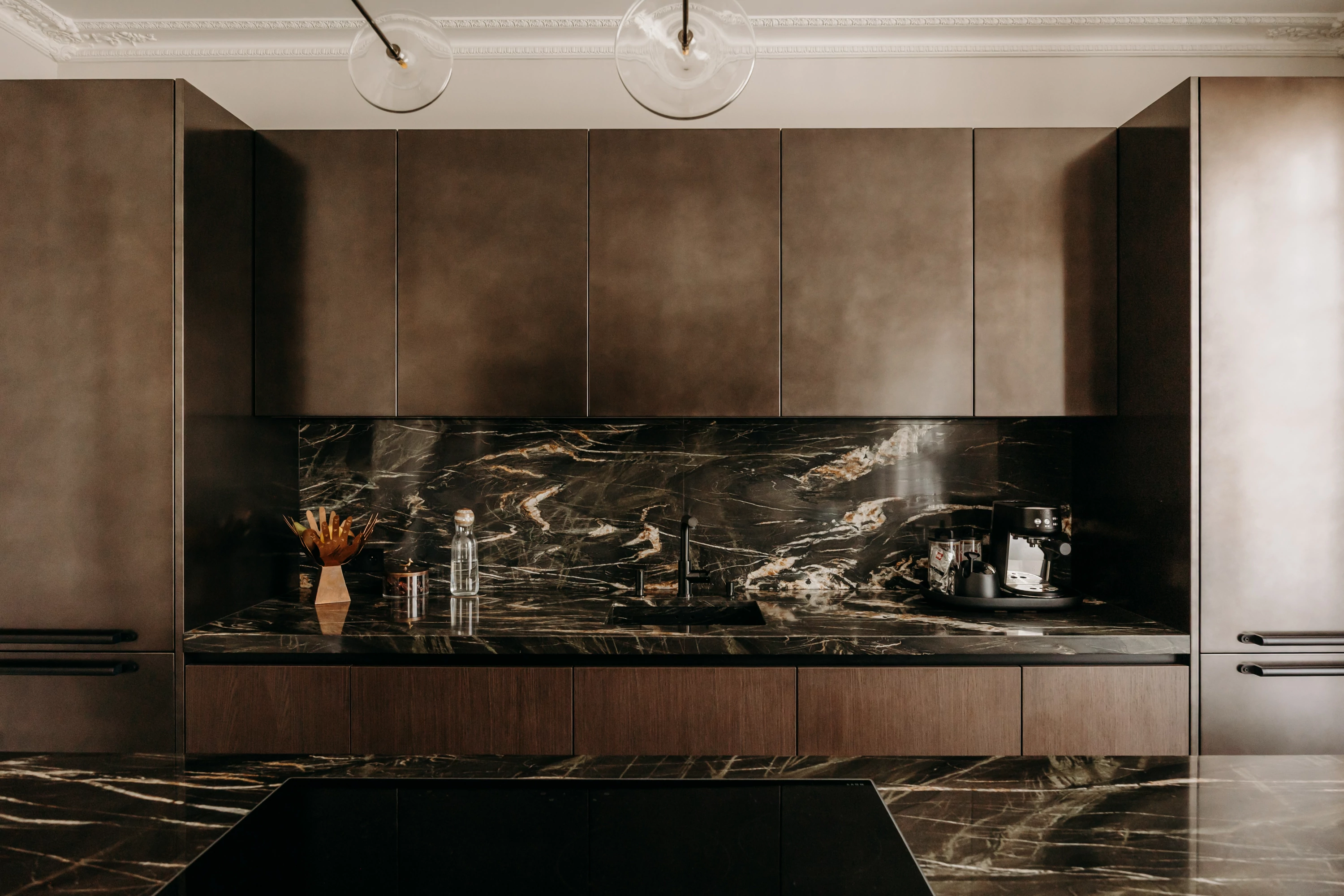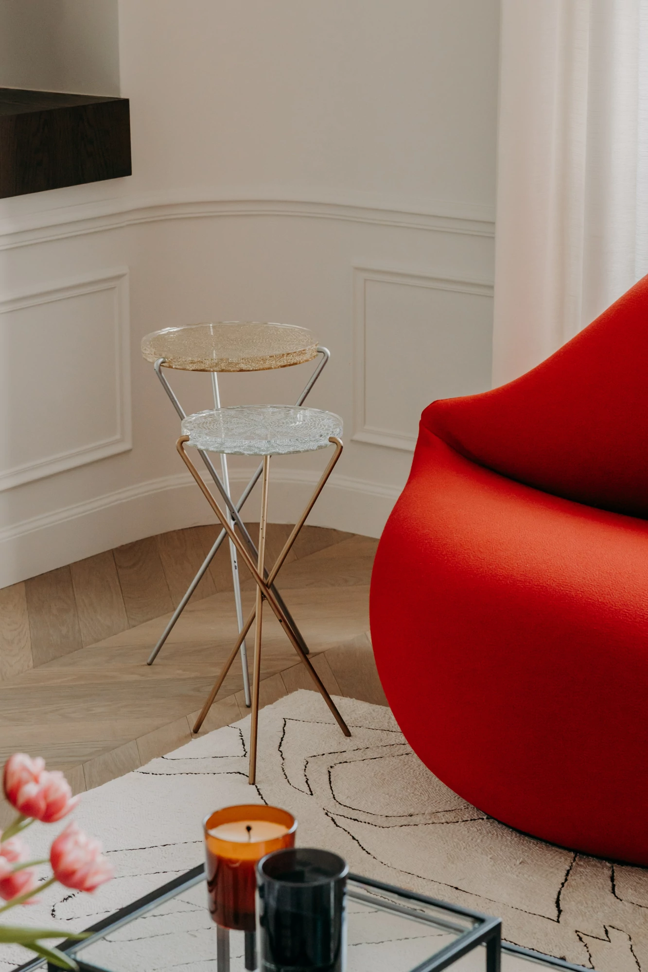 The semi-open kitchen flows seamlessly into the living room through visual openings. Crafted from high-quality materials (metallic lacquer, dark wood, and quartzite) it conceals all appliances for a clean, minimalist look. An aged mirror, finished with a trompe-l’œil effect, helps expand the space while concealing a restrictive load-bearing wall.
