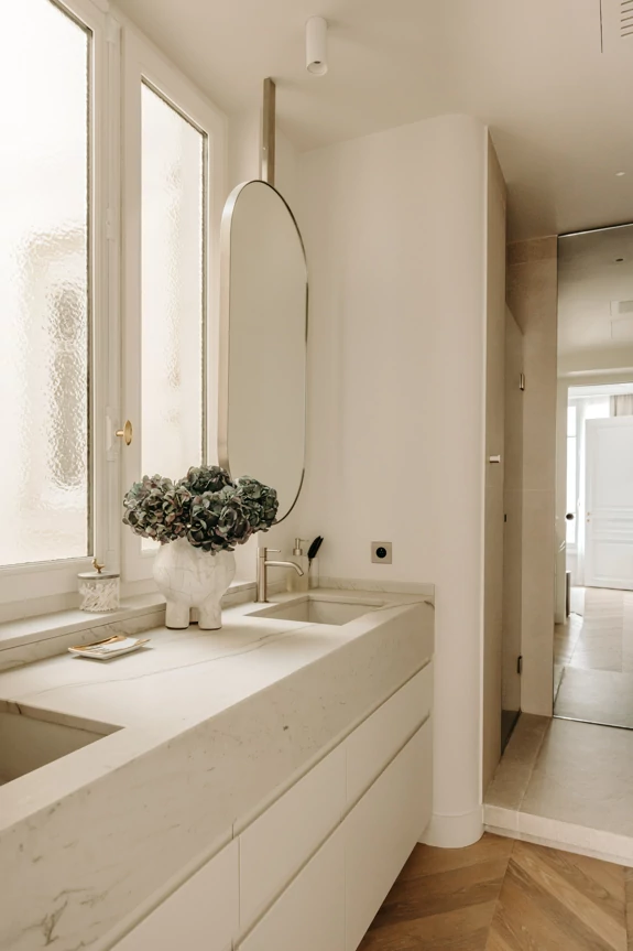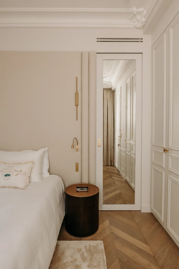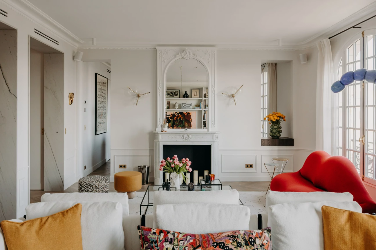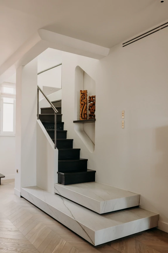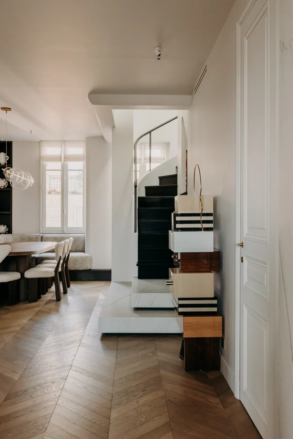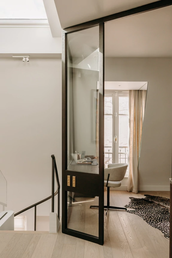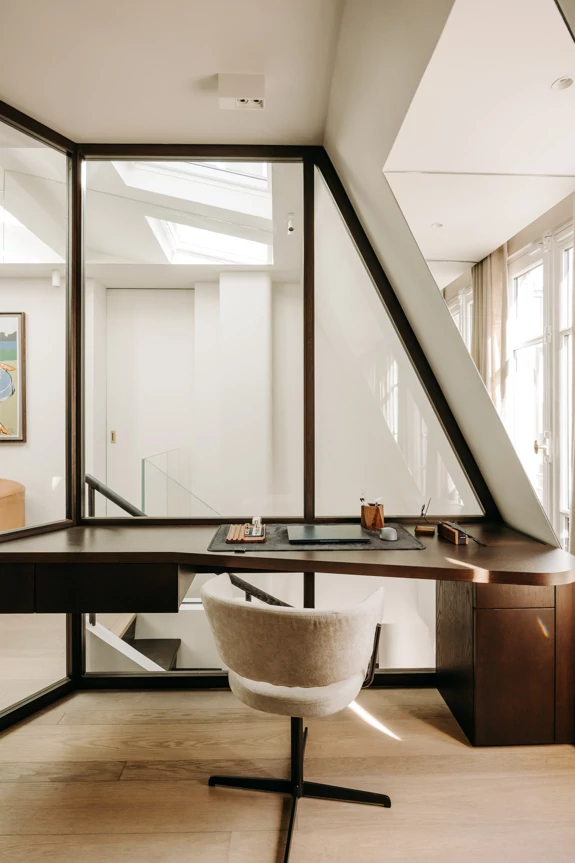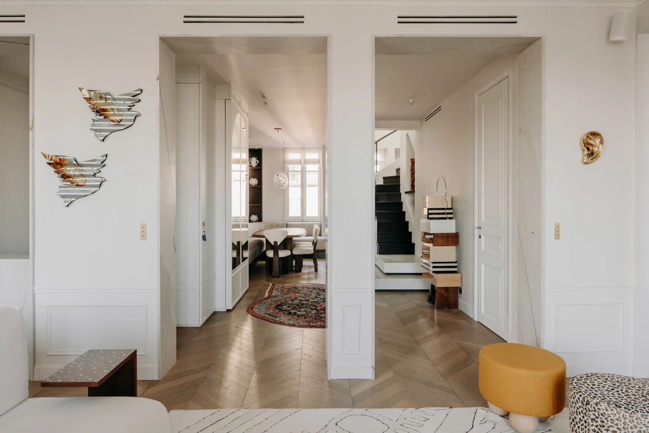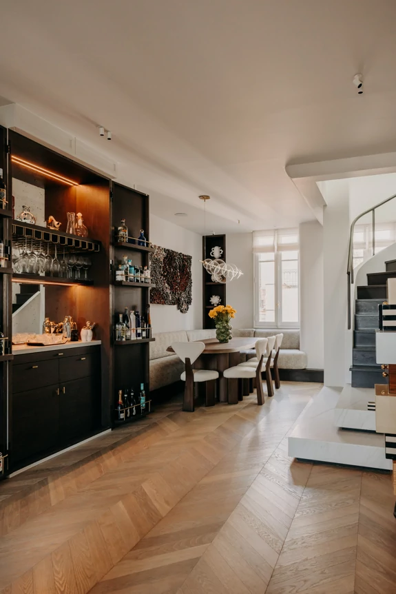 Just a stone's throw from the Eiffel Tower, this duplex was designed as a gathering place for a family that lives primarily abroad. It was intended to offer comfort, functionality, and a warm, welcoming atmosphere, while allowing each family member to maintain their independence. The goal was to create three bedrooms with en-suite shower rooms and walk-in closets, as well as a separate office, within a warm and inviting setting conducive to entertaining and family life.