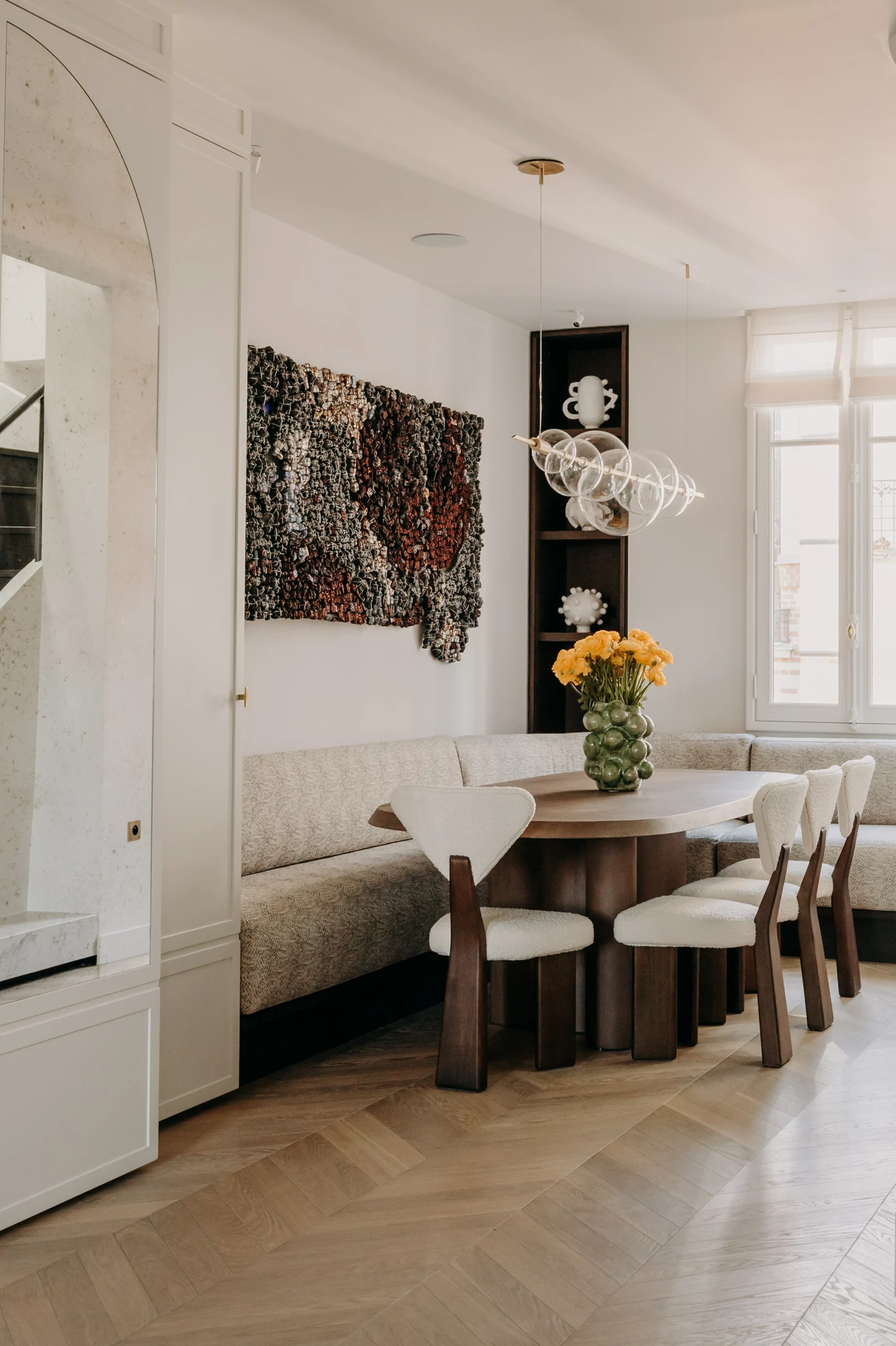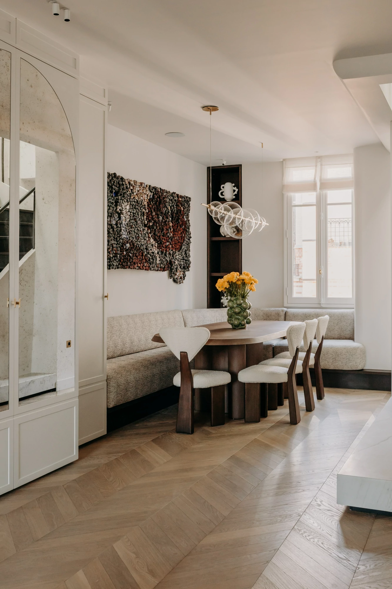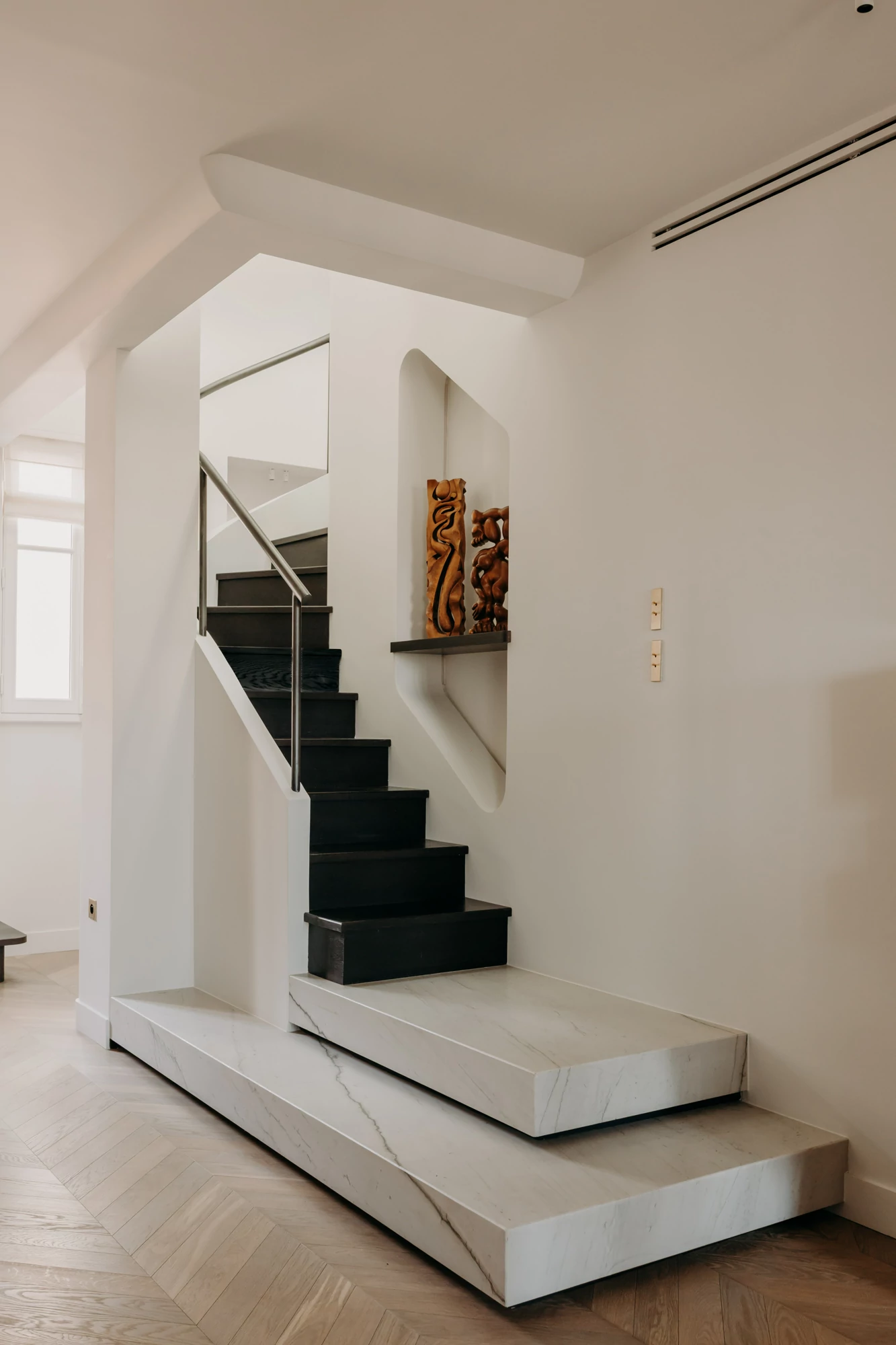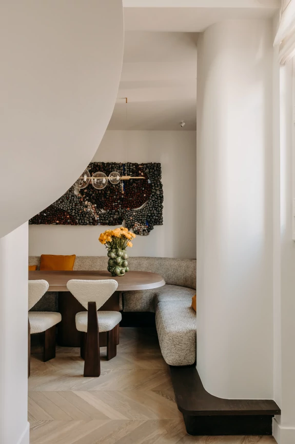 The entire duplex is designed around a palette of natural materials and neutral tones, providing the perfect backdrop for a collection of colorful artwork. Dark-stained oak, the project’s central theme, complements light-colored stone and recurring rounded shapes. In this project, every detail has been carefully considered to harmonize aesthetics, functionality, and quality of life.