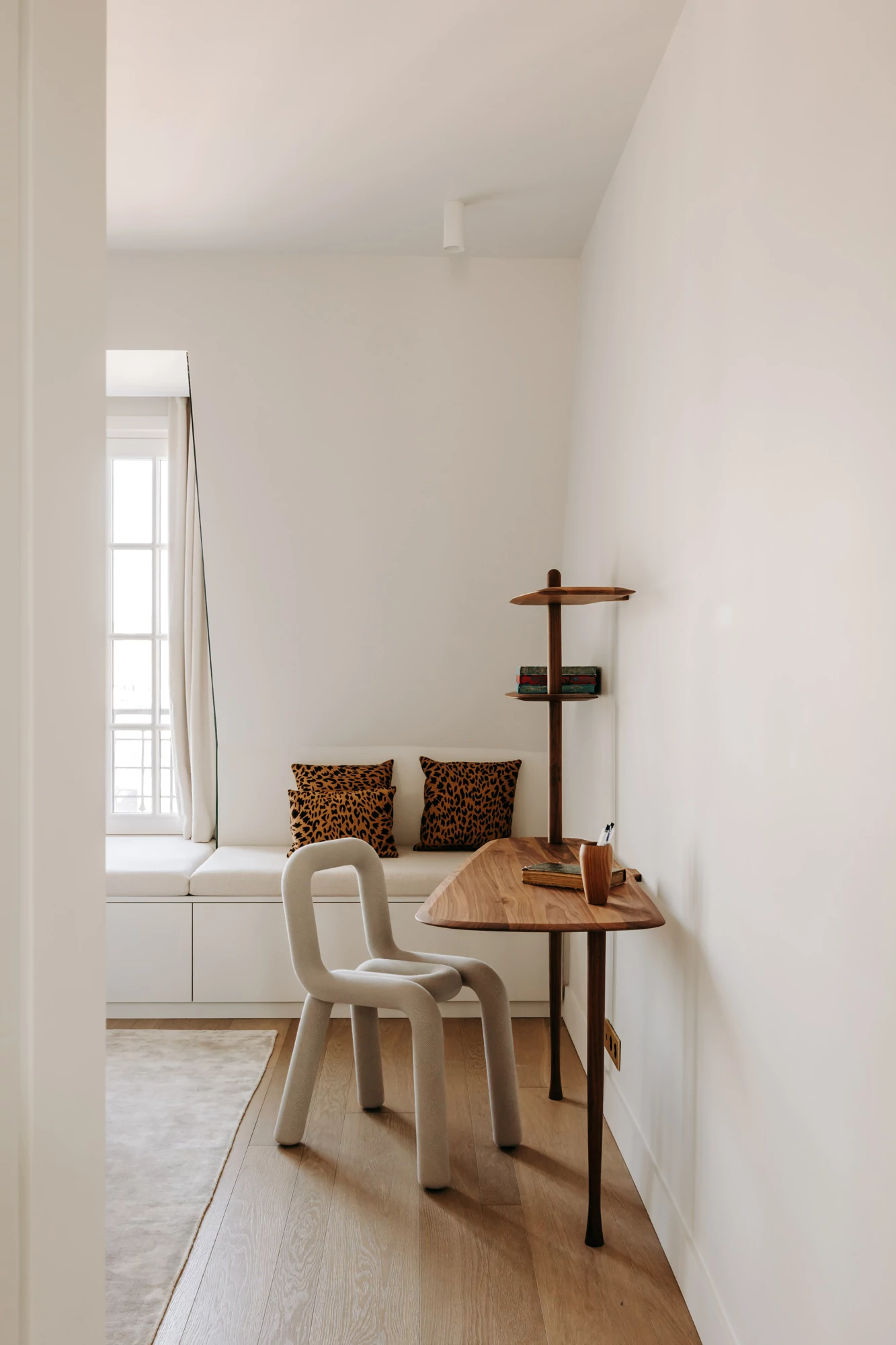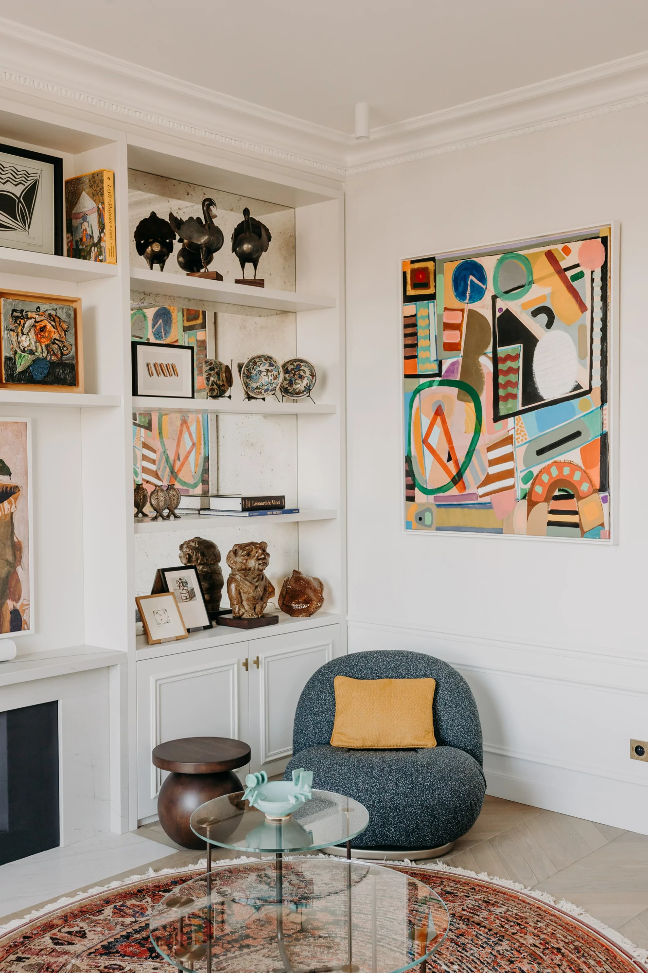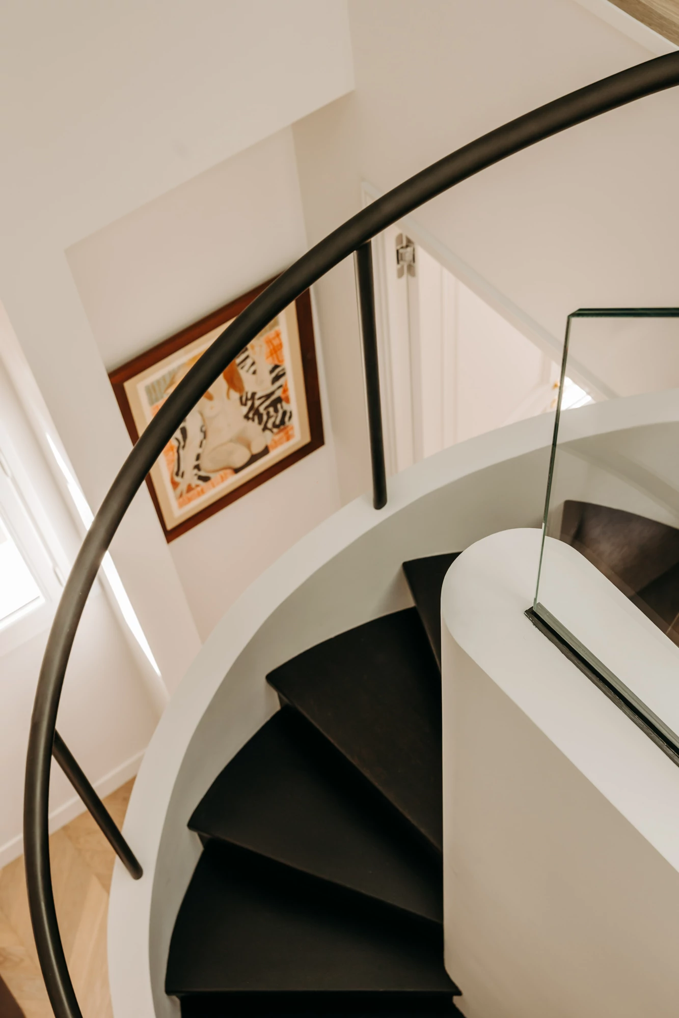 The entire duplex is designed around a palette of natural materials and neutral tones, providing the perfect backdrop for a collection of colorful artwork. Dark-stained oak, the project’s central theme, complements light-colored stone and recurring rounded shapes. In this project, every detail has been carefully considered to harmonize aesthetics, functionality, and quality of life.