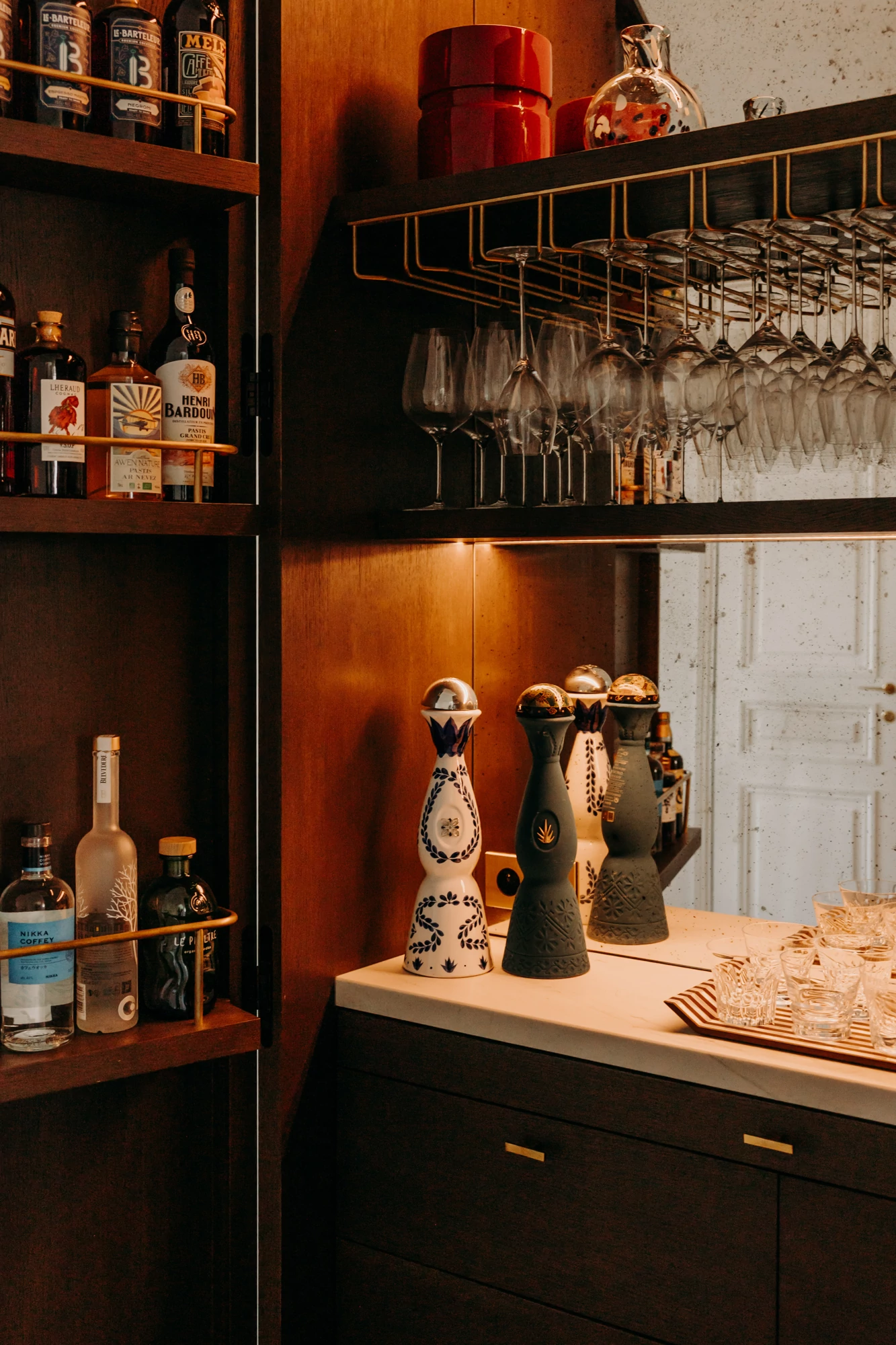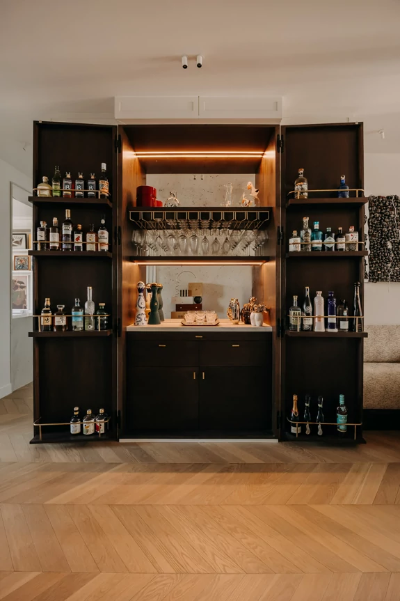 At the heart of the layout, a multifunctional circulation area incorporates storage, a bench seat, a large reception table, and a bar concealed within the woodwork. Designed to be hidden, the bar is revealed when opened, showcasing materials and objects through a play of reflections and light.
