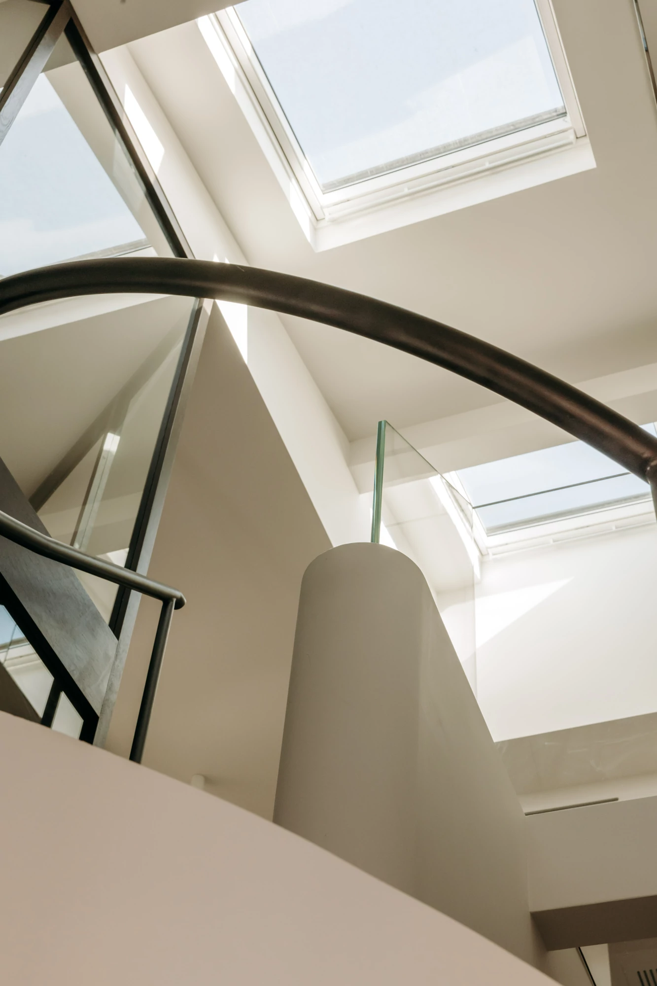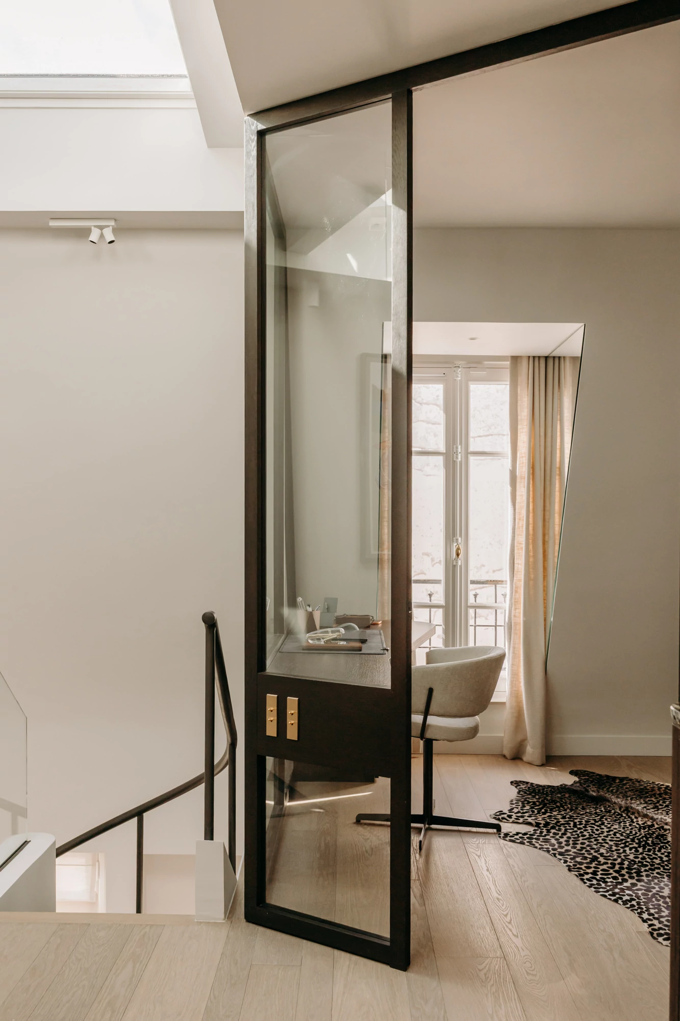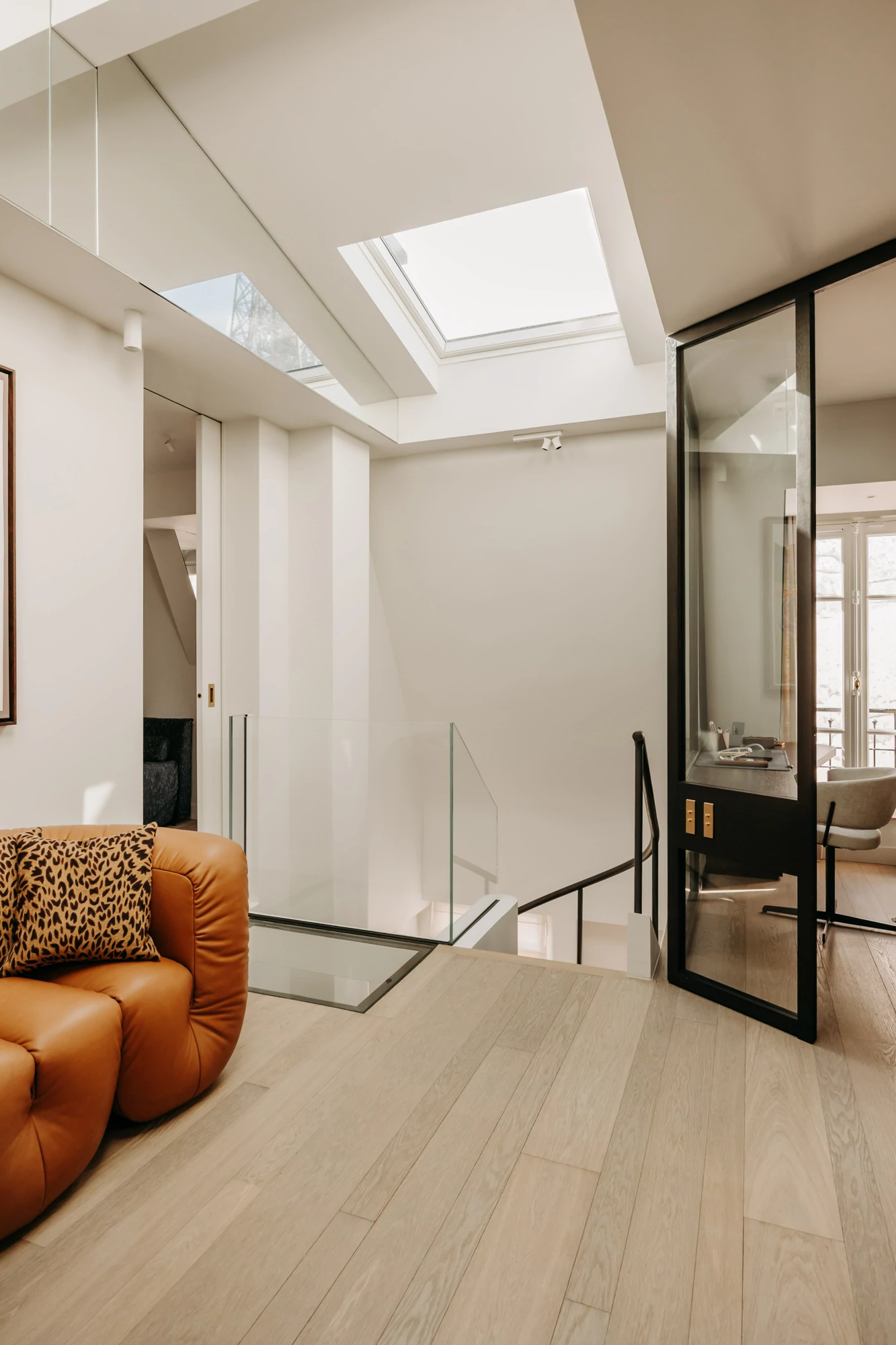 A glass landing was created to provide access to an additional room, formed by combining it with a former guest room, which has been converted into a TV room and office. This design also allows light to flow down to the lower level.