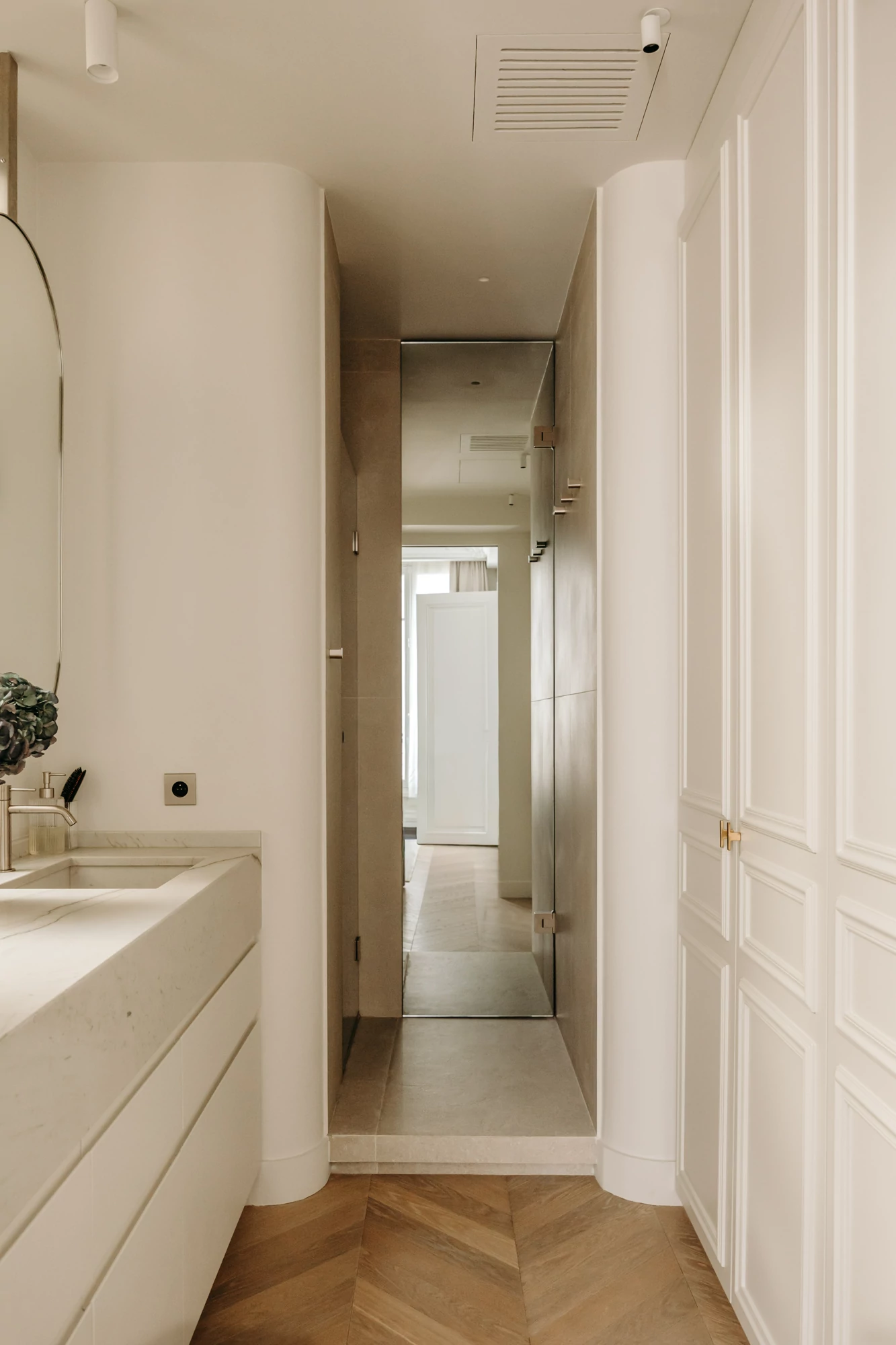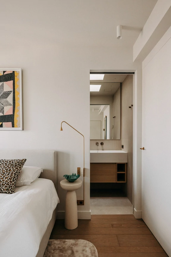 The master suite, accessible from the dining room, was designed as an intimate and seamless space. It features custom walk-in closets and an adjoining shower room, where every detail has been carefully considered to ensure everyday comfort: maximized natural light, subtle ambient lighting, and materials that harmonize with the rest of the project.