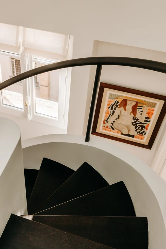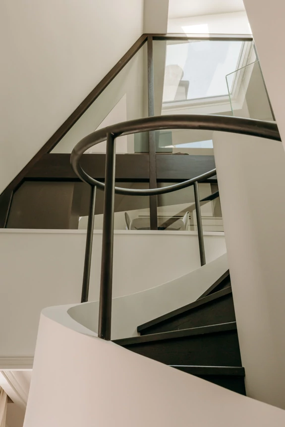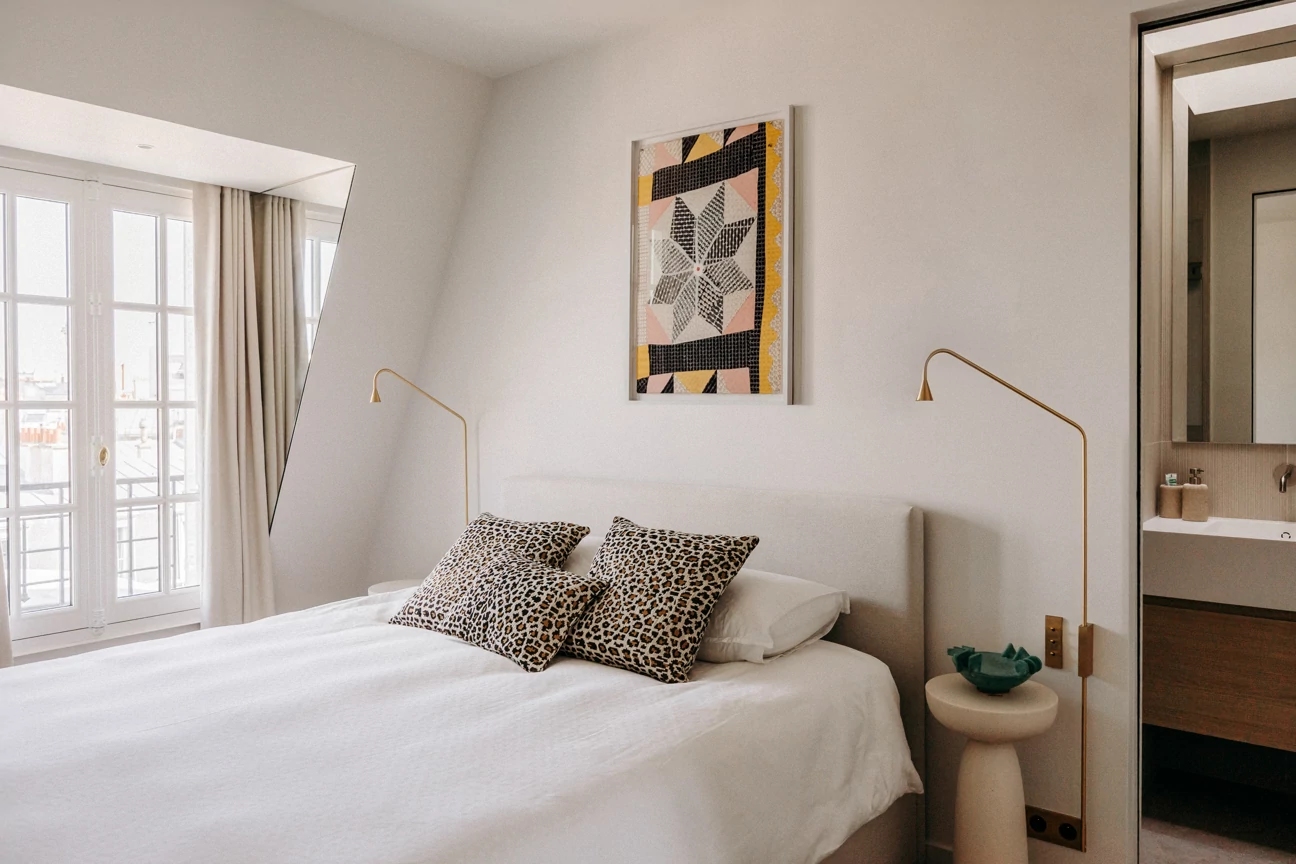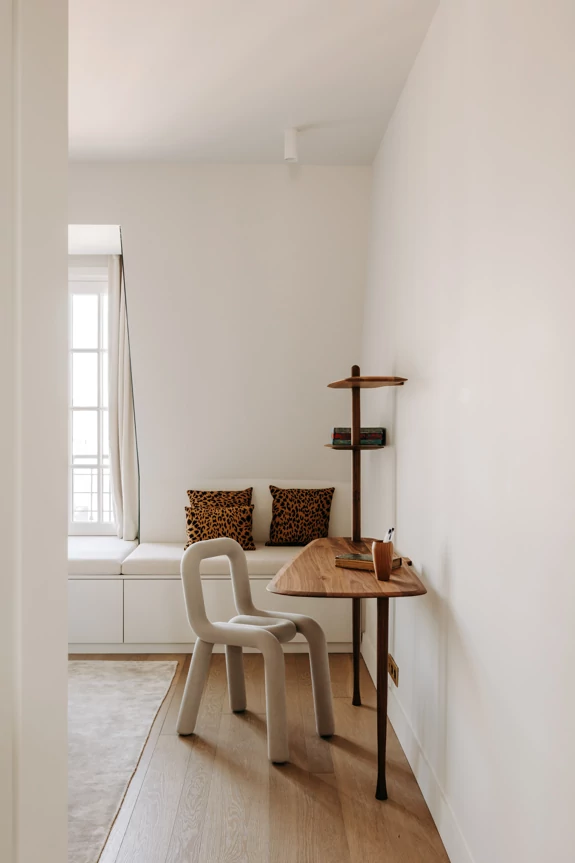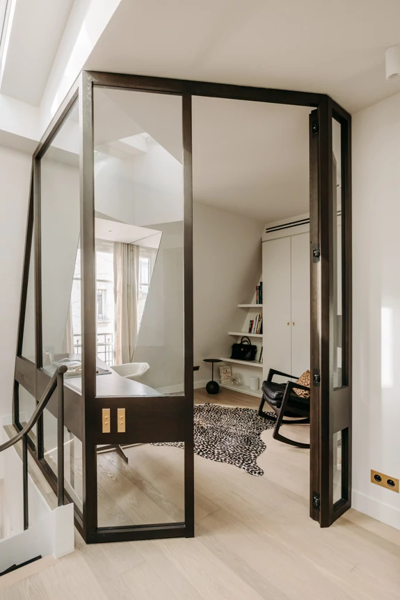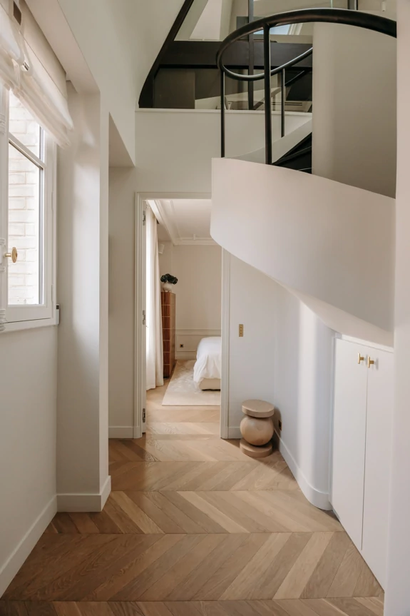In the attic, the floor has been completely redesigned to unlock its potential and maximize natural light. The space, which was once partitioned off, now opens up around a central star-shaped circulation area, bathed in light thanks to large skylights offering a view of the Eiffel Tower.