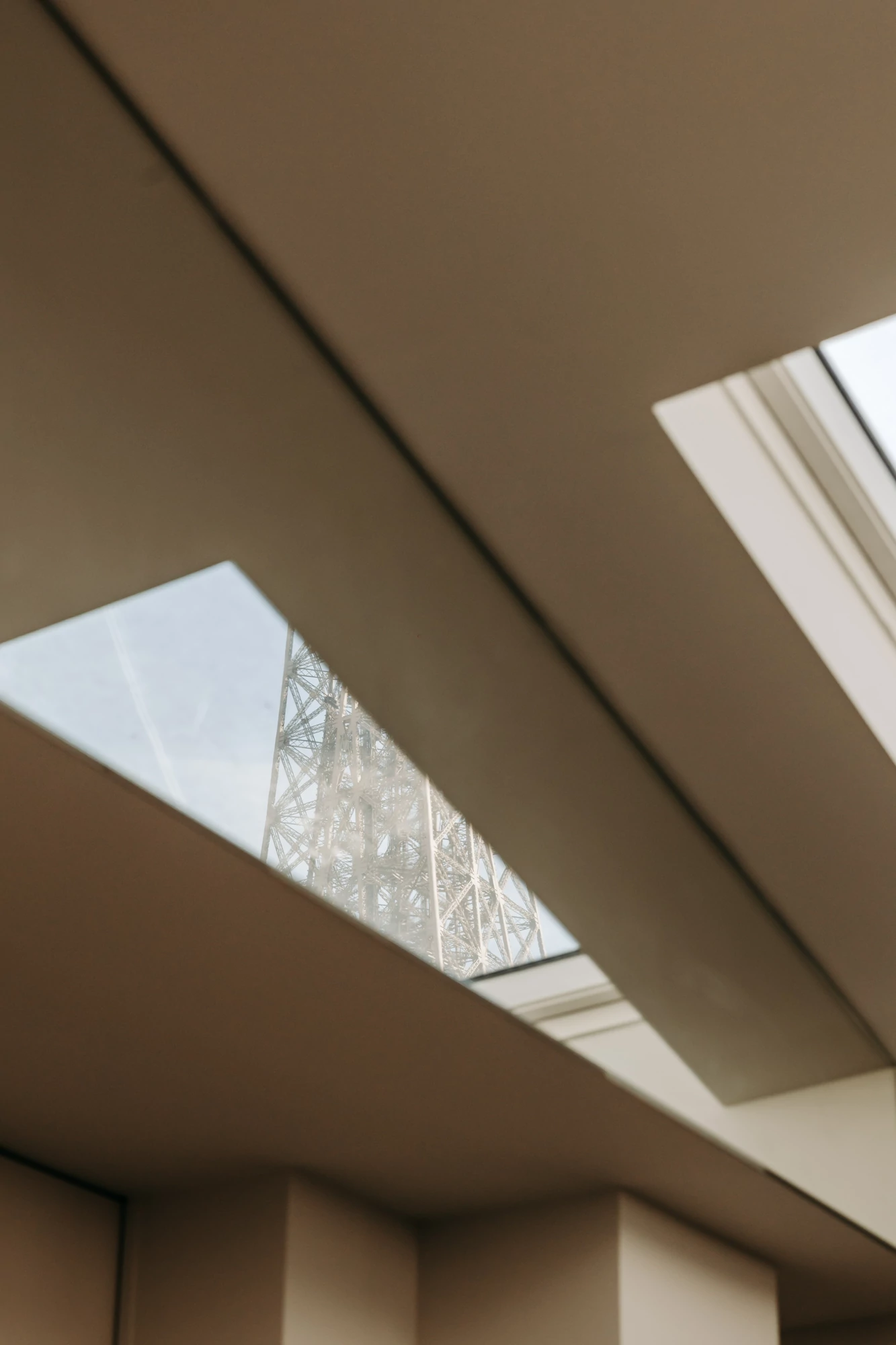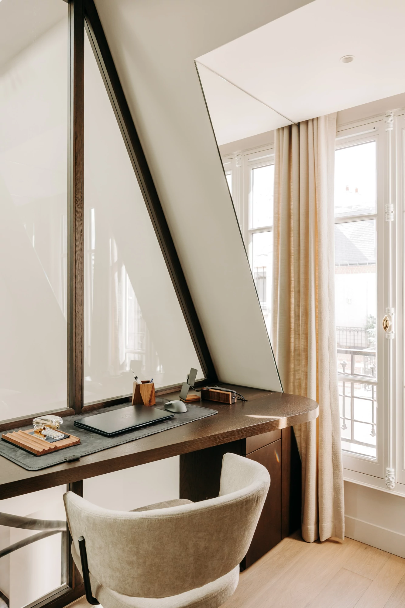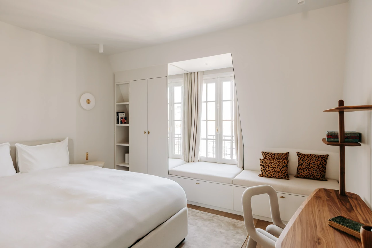 In the attic, the floor has been completely redesigned to unlock its potential and maximize natural light. The space, which was once partitioned off, now opens up around a central star-shaped circulation area, bathed in light thanks to large skylights offering a view of the Eiffel Tower.